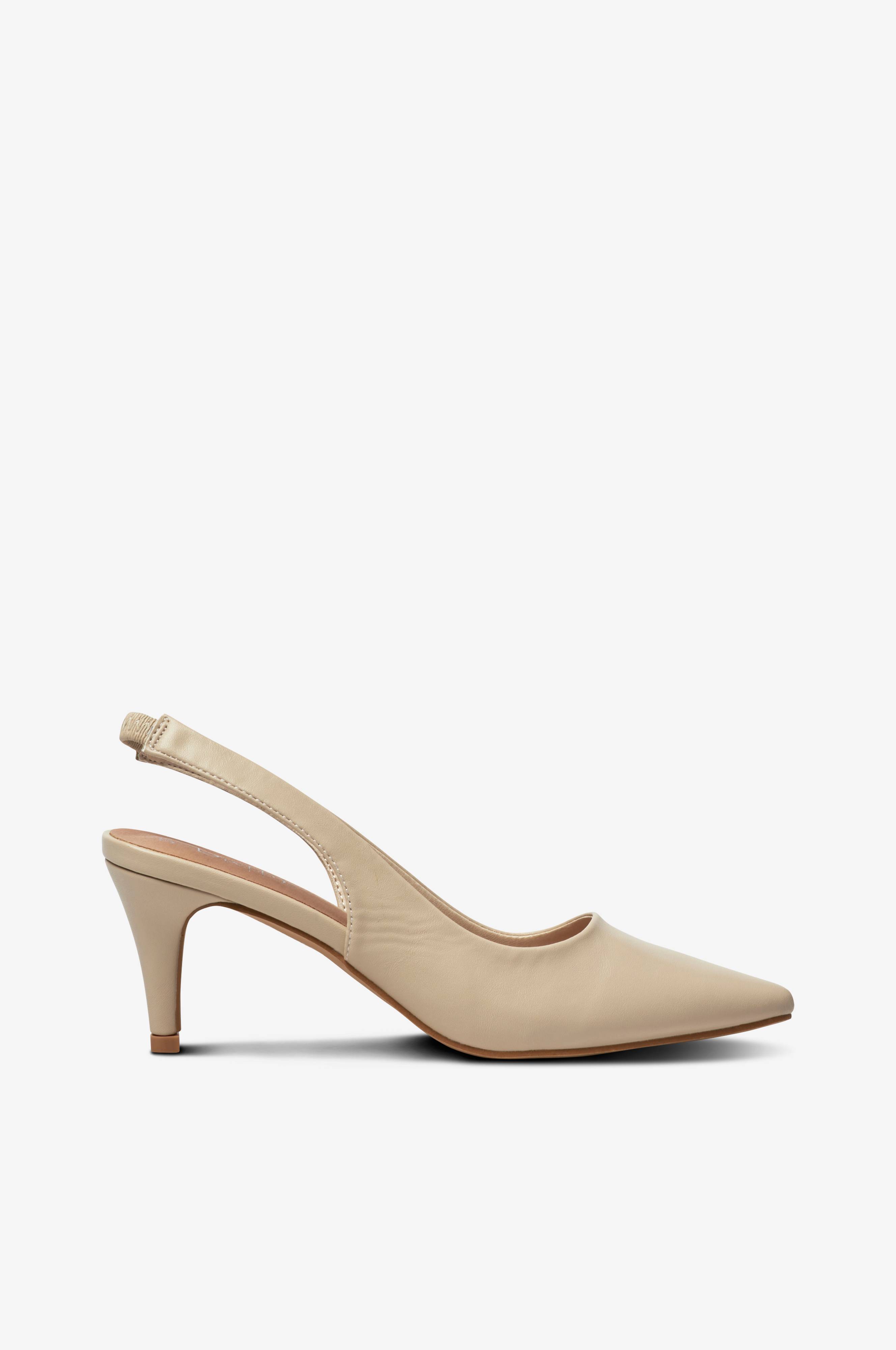 Pumps i imiteret skind af PU. Spids tåform og beklædt hæl. Blødt polstret fodseng i skindlook. Ankelrem med elastik bagpå. Hælhøjde ca. 6 cm.