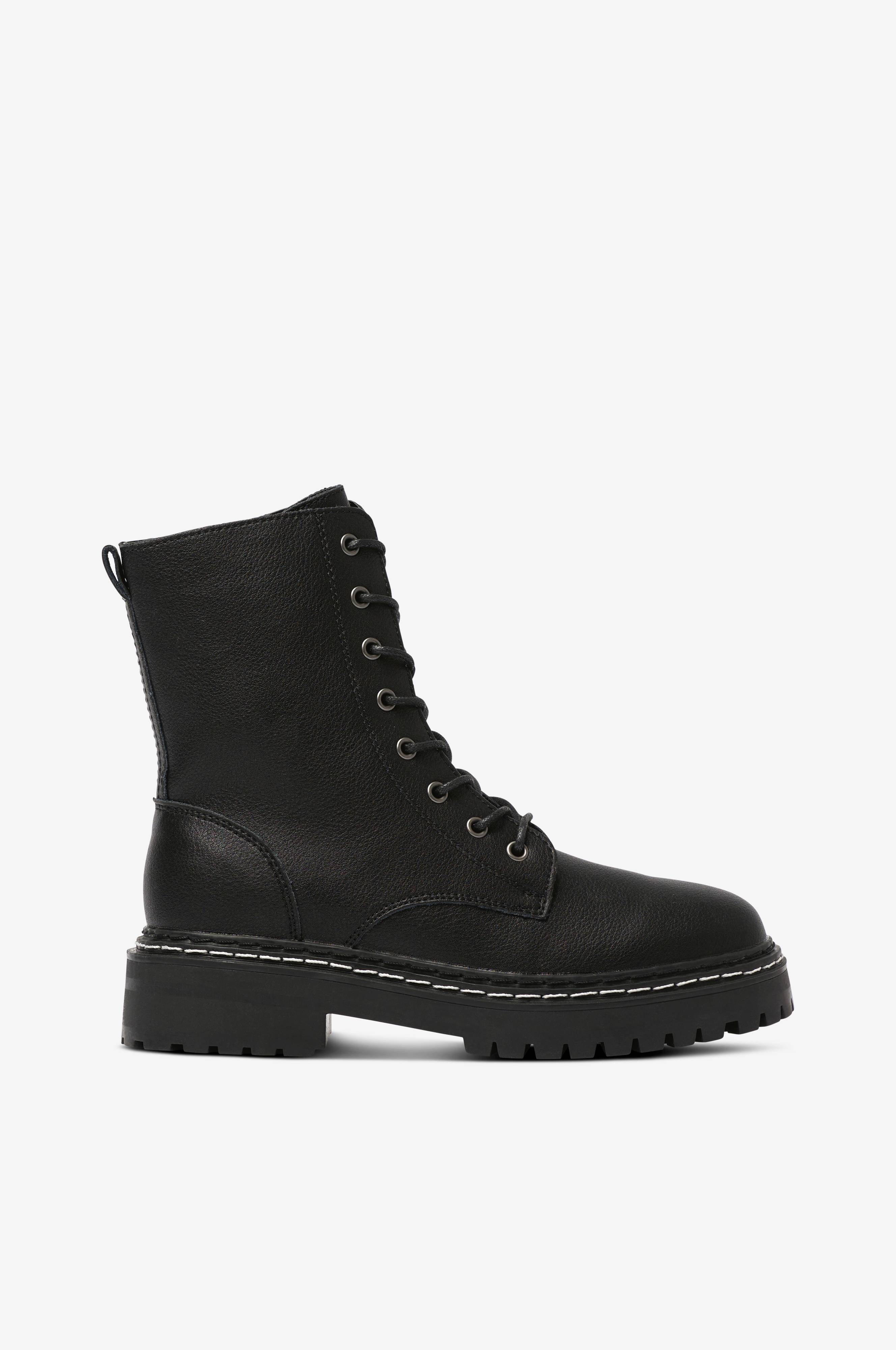 Støvle i fleksibelt skind med snøre foran. Klassisk model med en grovere sål og hæl. Hvid pyntesøm rundt om sålekanten. Varmende velourfor på indersiden. Skafthøjde ca. 15 cm, hælhøjde ca. 4 cm.