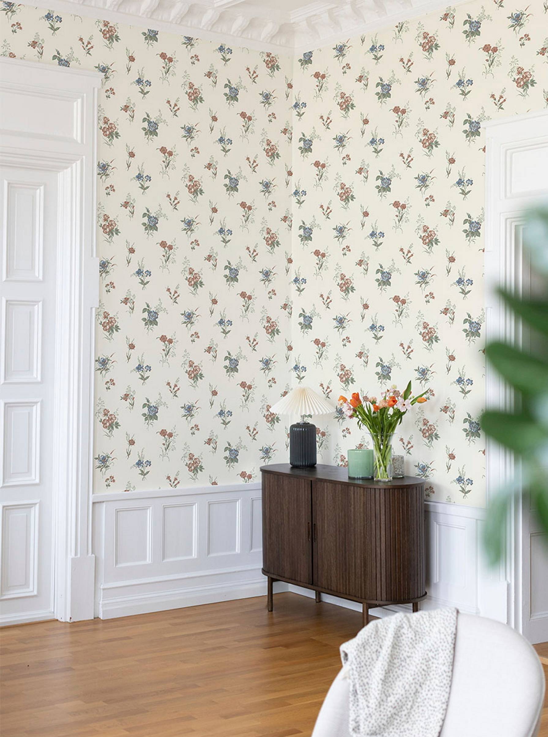 Amalia er et tapet, som byder ind med ro og blødhed. De klassiske buketterna har et romantisk udtryk, men med en lethed, som gør, at de passer i alle rum, fra soveværelse til stue. Mönstret har en fin rytme, hvor blommorna placerats med varsam hand. Det er et tapet som skaber stämning snarare än att ta plats, som en vänlig närvaro i bakgrunden, alltid där, alltid vacker.
