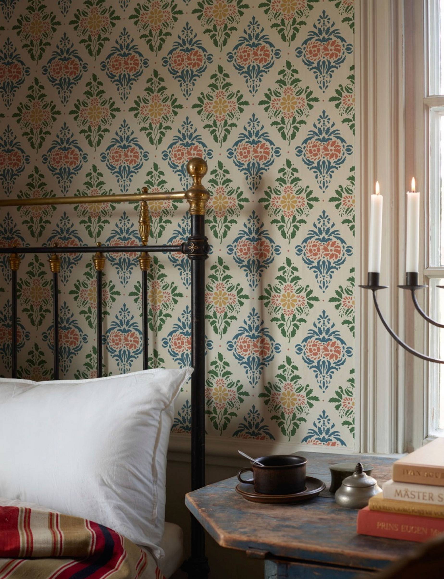 Målaren jonas wallström föddes i arbrå år 1798 och förblev bosatt i sin födelsesocken genom hela sitt liv. Han utförde många rumsdekorationer i sin hembygd, bland annat på gården gästgifvars i vallsta, vars motiv har inspirerat den här tapeten. Wallström foretrak at arbejde med schabloner og anvende en ren og tydelig farveskala i sit arbejde. med sina klara färger och mönster från 1800-talet skapar gästgivars en klassisk gammaldags känsla i hemmet.