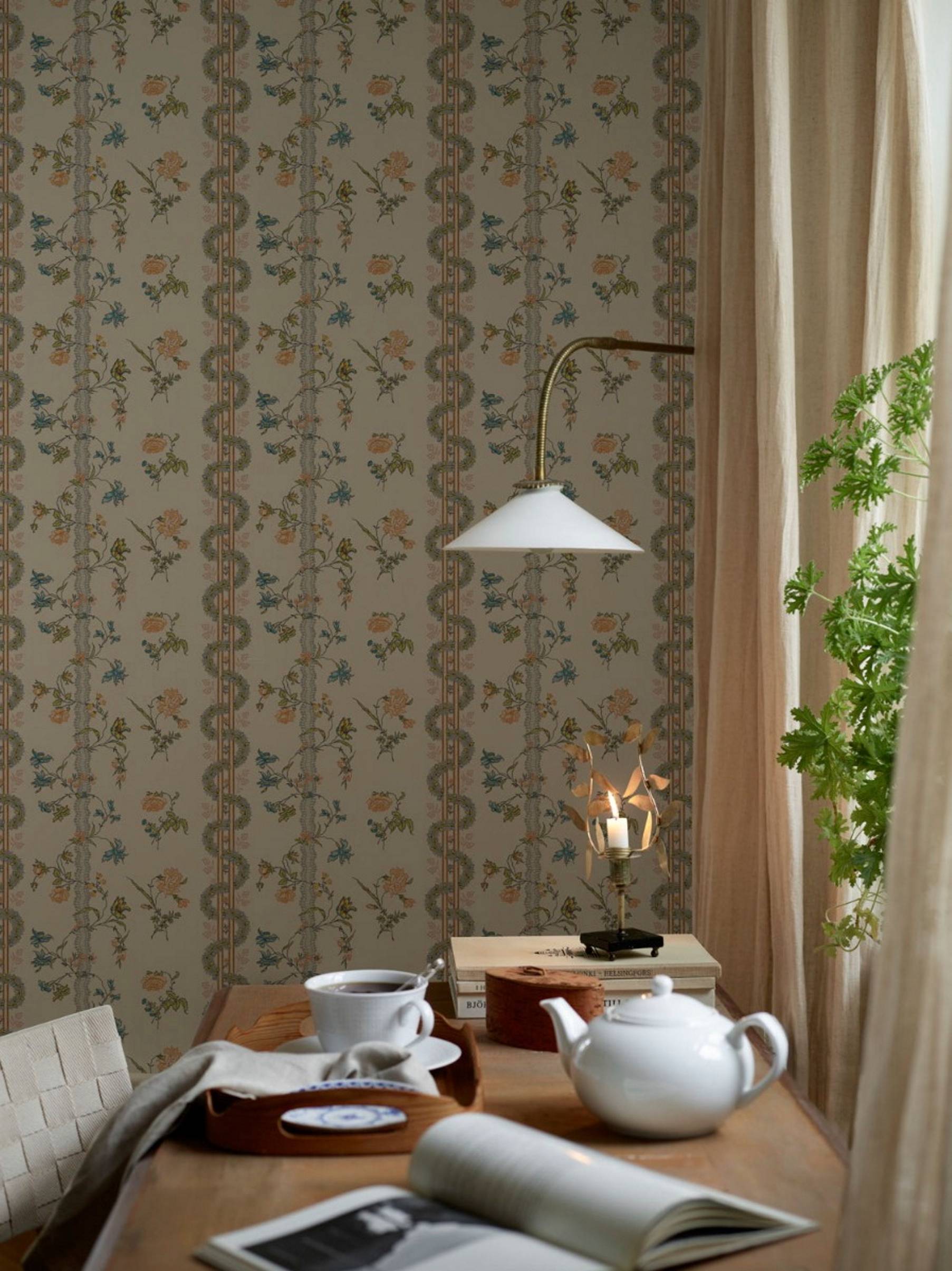Förlagan till tapeten är blocktryckt och handkolorerad, och kommer från stora nyckelviken i nacka. Det slingrende mönstret av blomrankor och sirliga spetsar tillhör rokokons mest älskade uttryck. Originalet, som kan dateres til senere del af 1740-tallet, prydes af en rig og klar farveskala og er et af de mest elegante eksemplarer inden for sin mönstertyp.