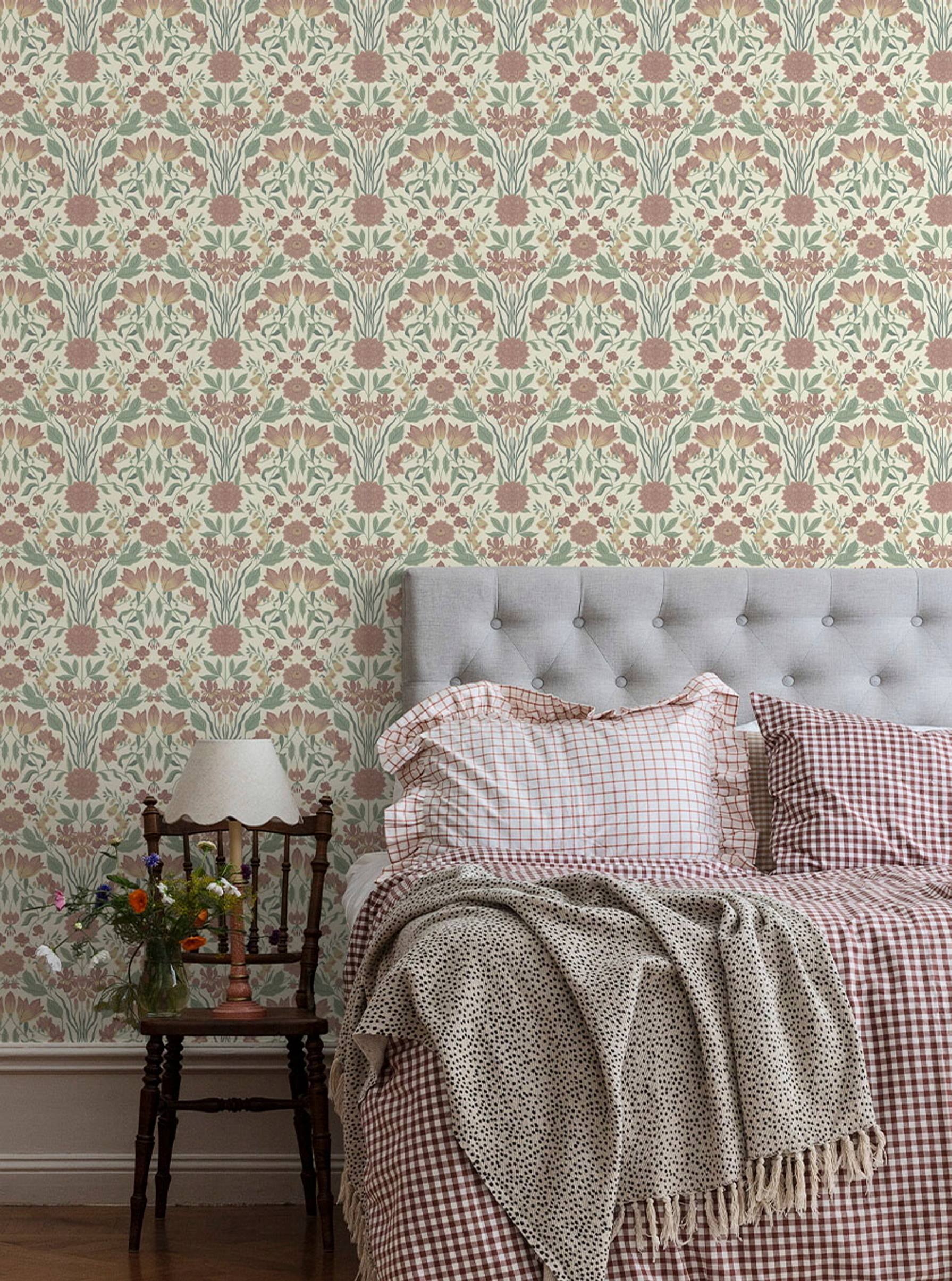 En blomstrende fest på vejen. trädgården är en tapet fylld av liv och färg, inspirerad av den egna täppan där iris, löjtnantshjärta och dahlia samsas i rabatten. Mönstret är rikt och rytmiskt, som en blomstrande fest där varje detalj bär på glädje och närvaro. de djupa, varma färgerna ger en levande stämning, samtidigt som kompositionens mjukhet skapar balans och harmoni. design: anna göran