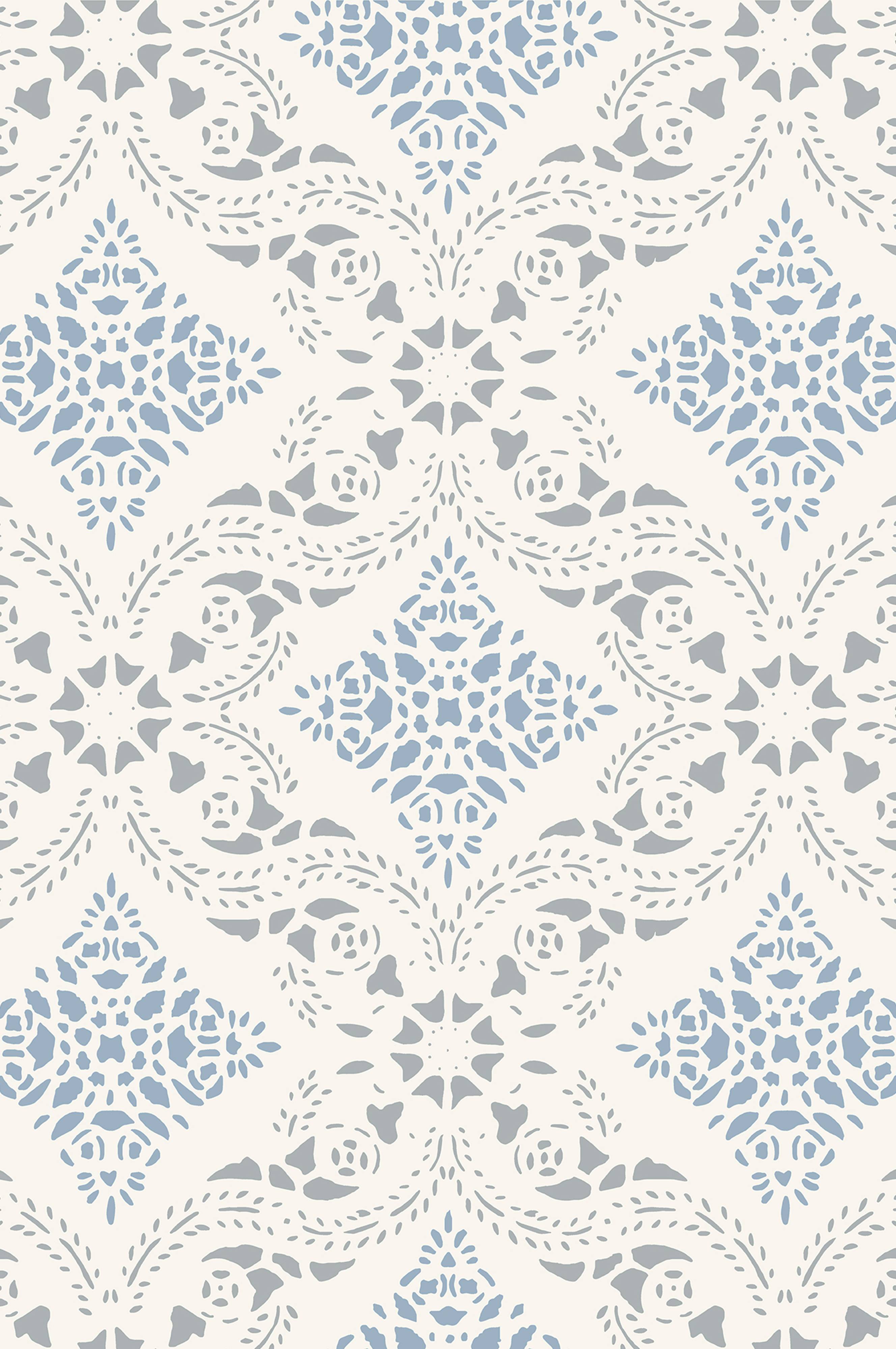 Tapetprøve til tapet Dahlströmskagården, farve blå.Mål på denne prøve er ca. 210 x 297 mm (svarer til en A4-side).