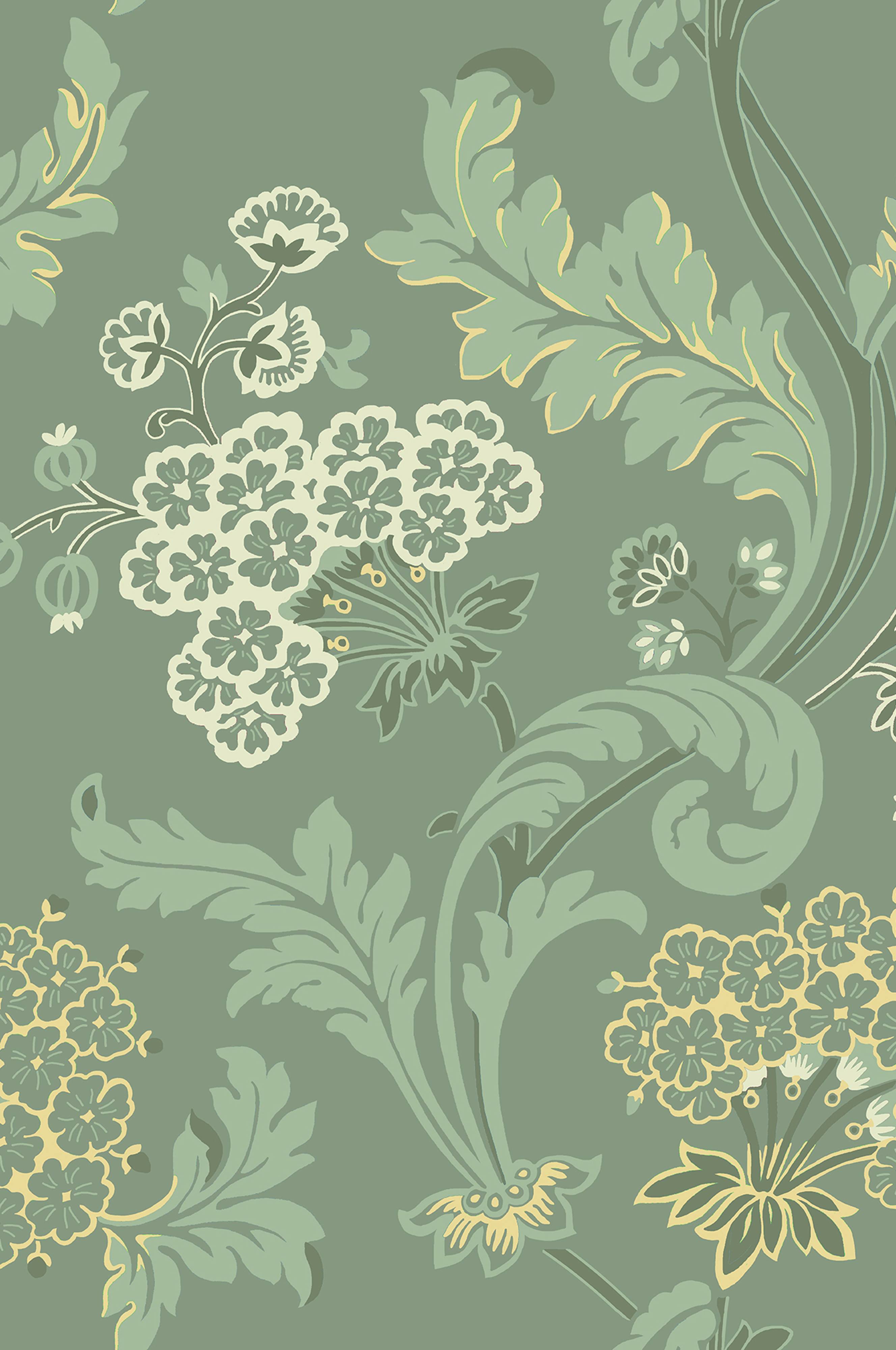 Tapetprøve til tapet Lydias Gård, farve grøn.Mål på denne prøve er ca. 210 x 297 mm (svarer til en A4-side).
