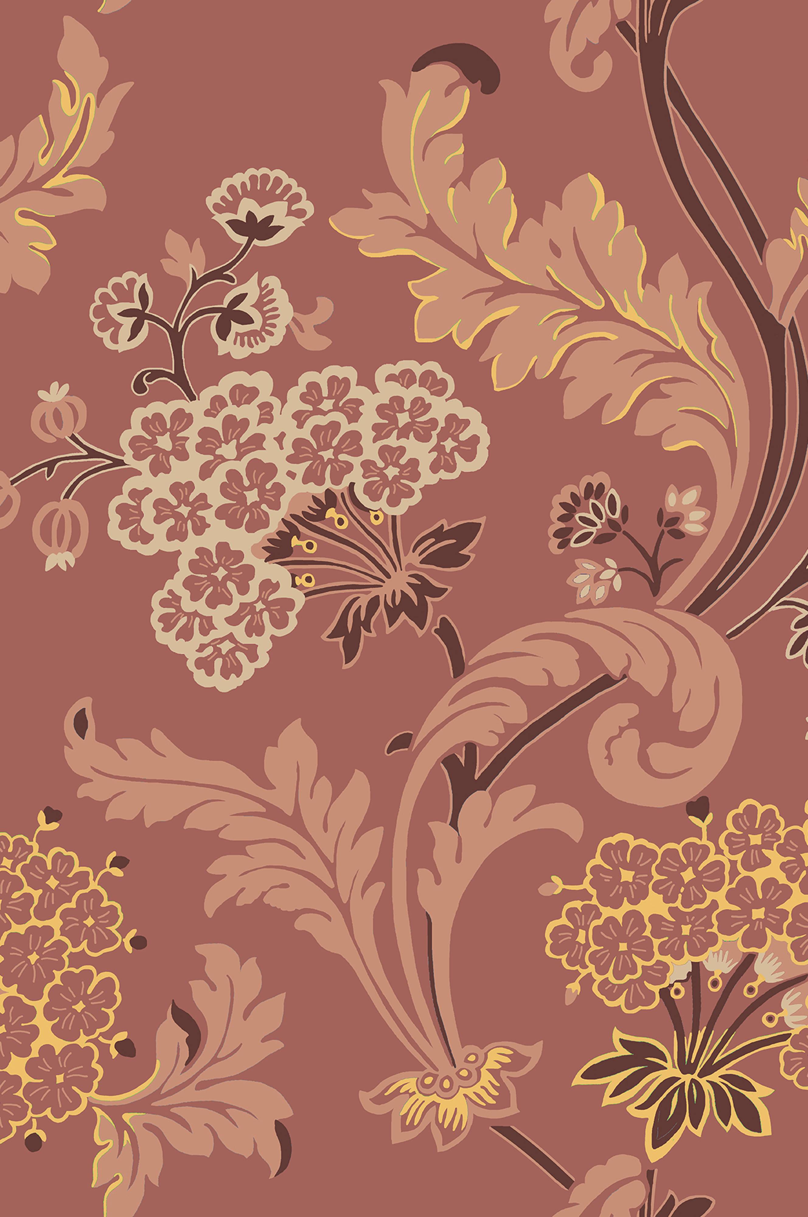 Tapetprøve til tapet Lydias Gård, farve rød.Mål på denne prøve er ca. 210 x 297 mm (svarer til en A4-side).