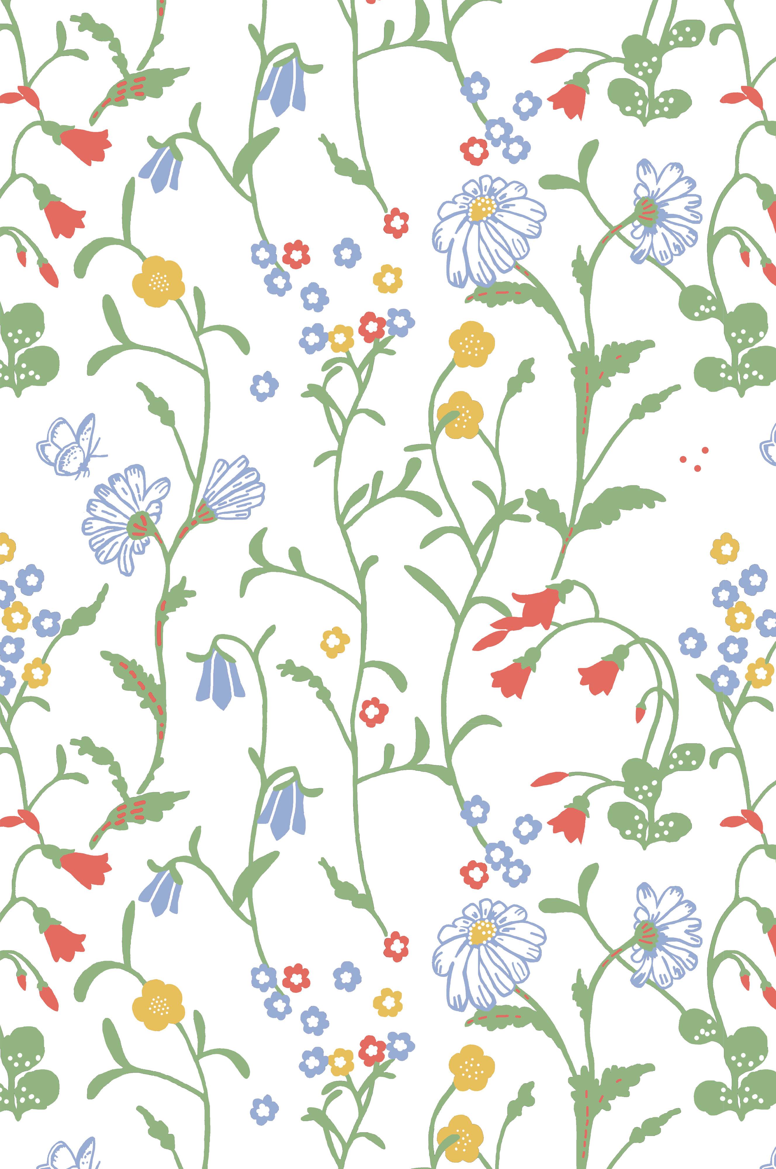 Tapet Midsommar hvid bestiller du på varenr. 1028366-01-0. Tapetet leveres i rulle med længde 10,05 m og bredde 53 cm.