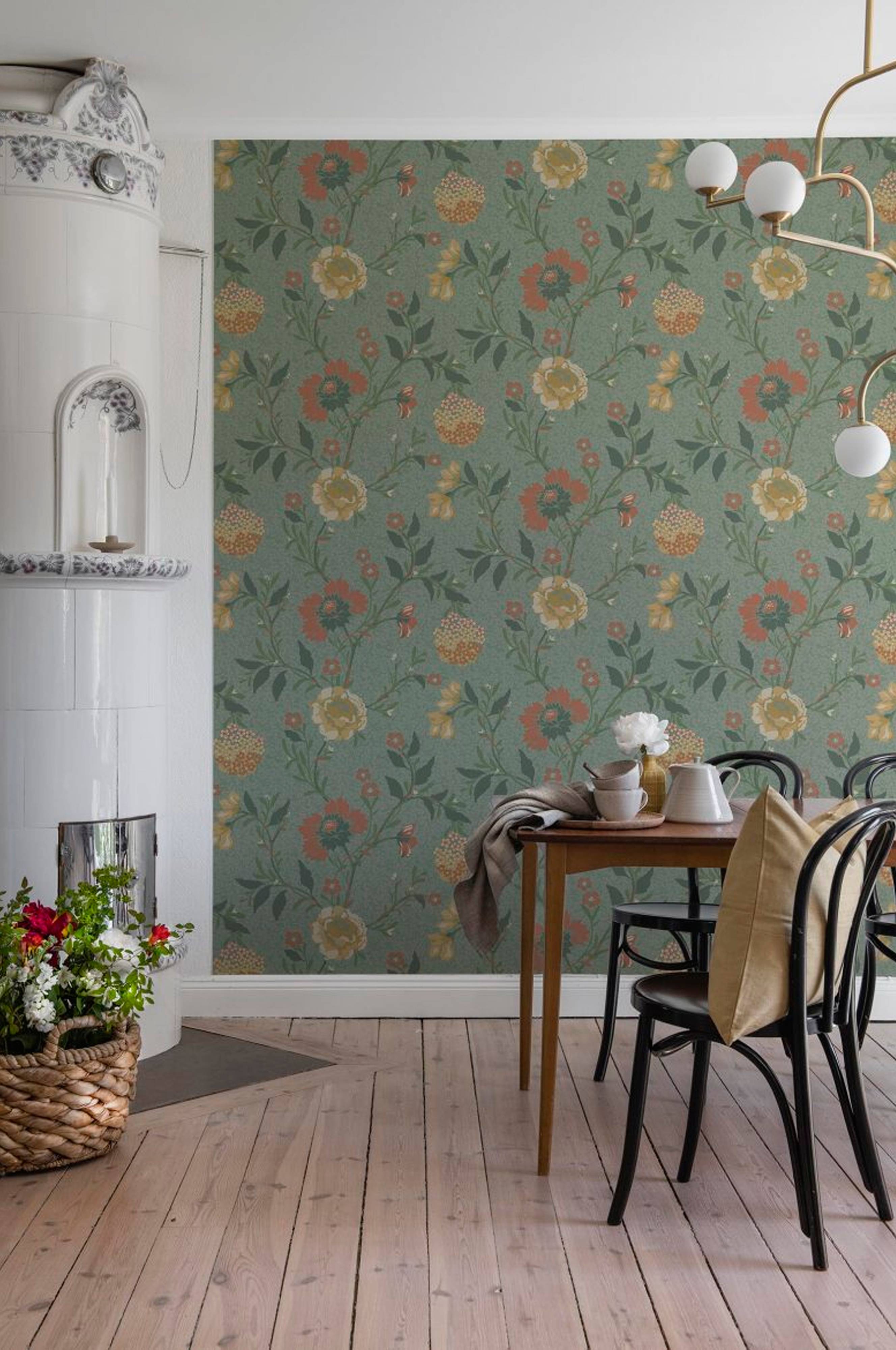 Tapet Vildros grøn bestiller du på varenr. 1664997-03-0. Tapetet leveres i rulle med længde 10,05 m og bredde 53 cm.