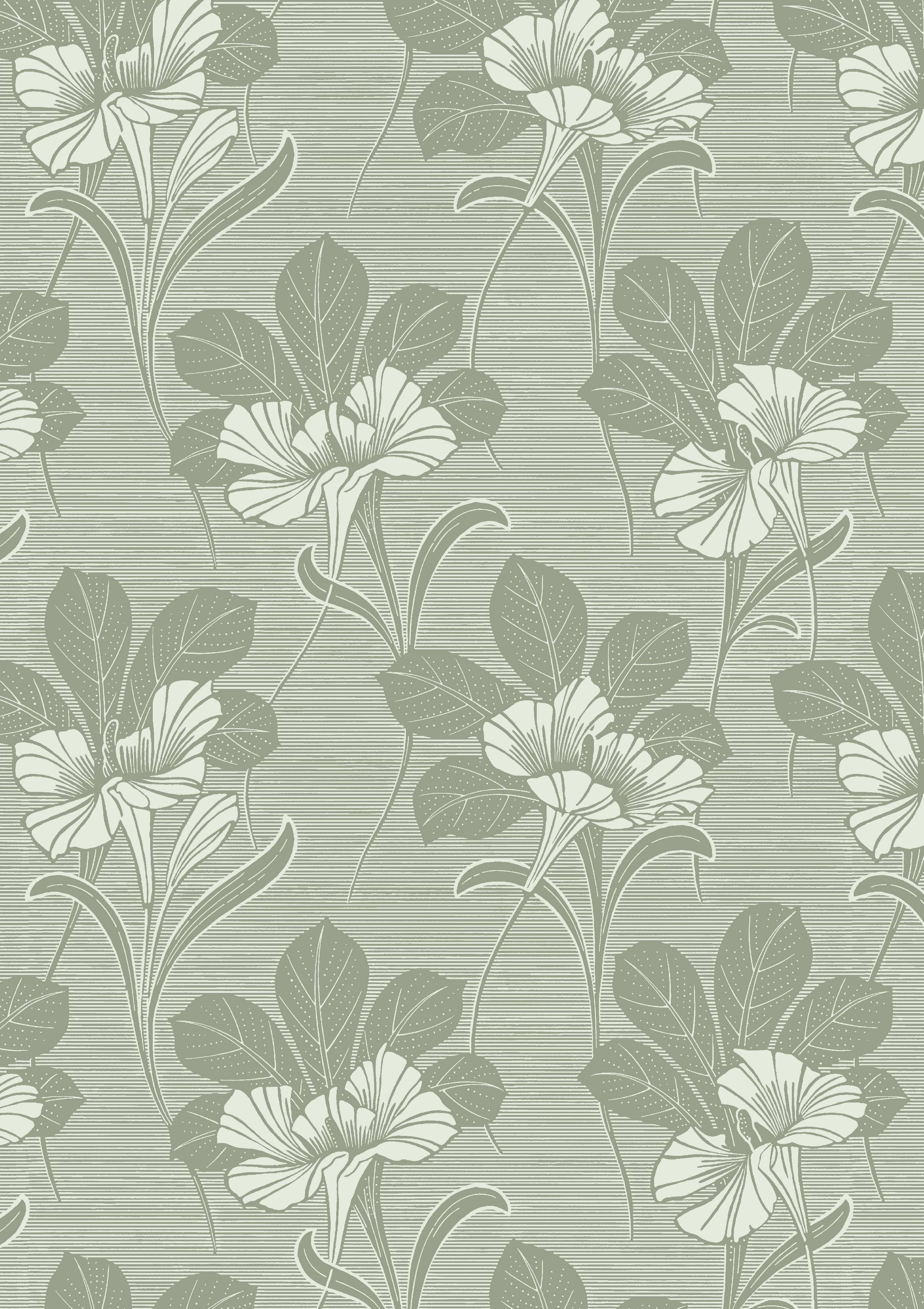 Tapetprøve til tapet Vilhelmina, farve grøn.Mål på denne prøve er ca. 210 x 297 mm (svarer til en A4-side).
