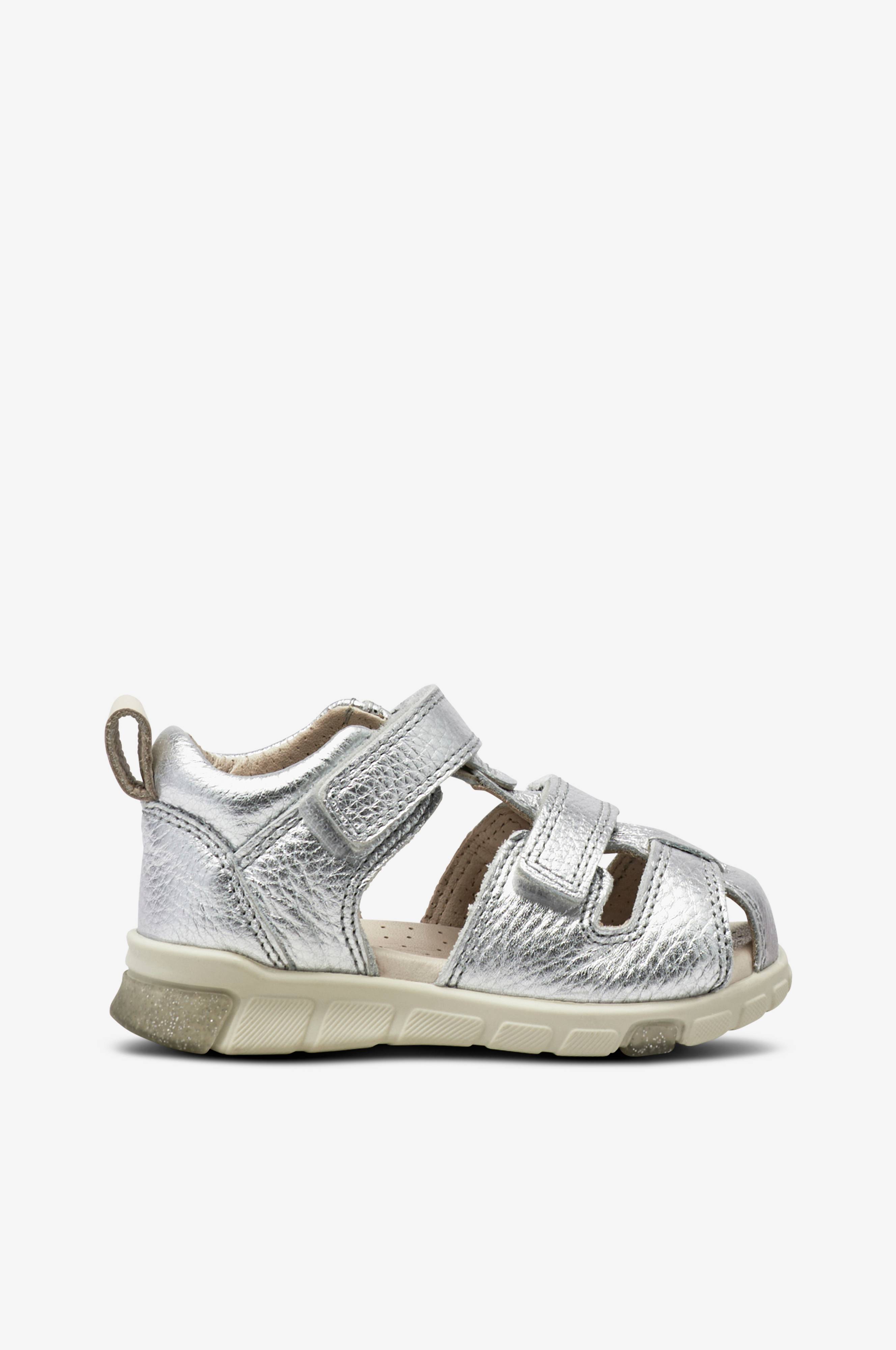 • Sølvfarvede sandaler i læder• To justérbare remme over foden• Blødt for i læder• Let ydersål