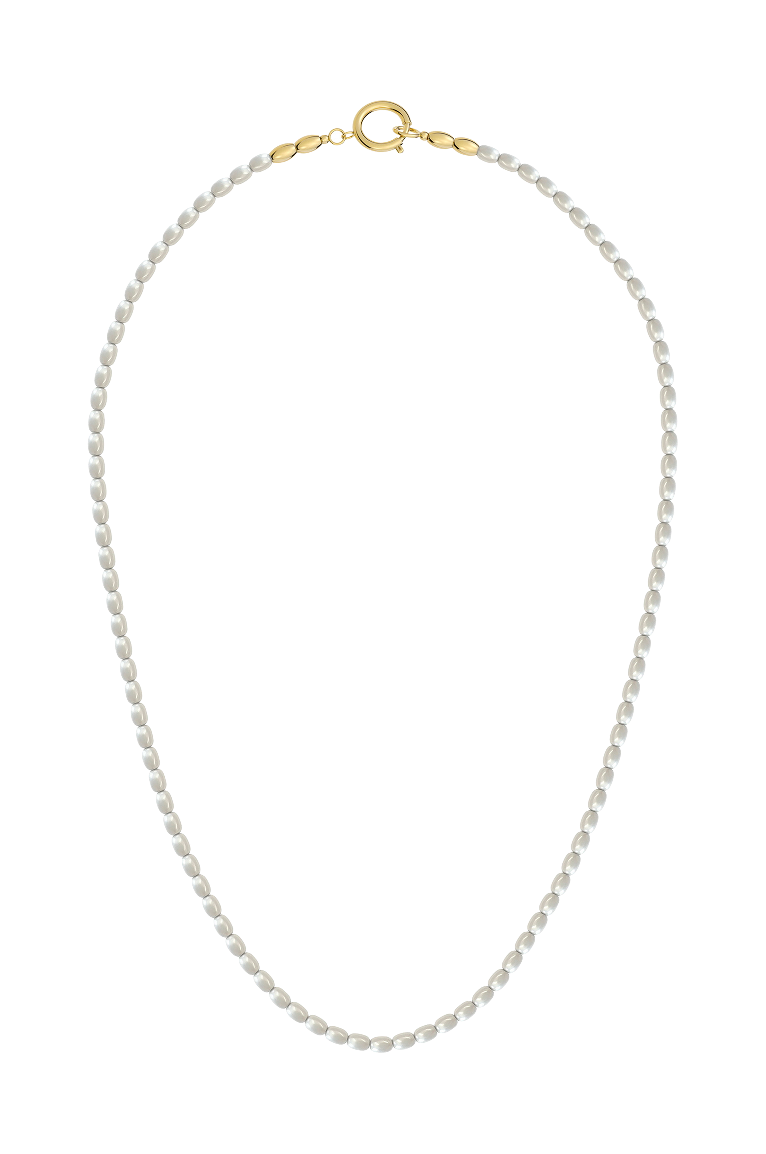 Halskæde med små afrundede perlemorsperler, der afsluttes med to metalperler på hver side i skinnende 14k guldbelægning.