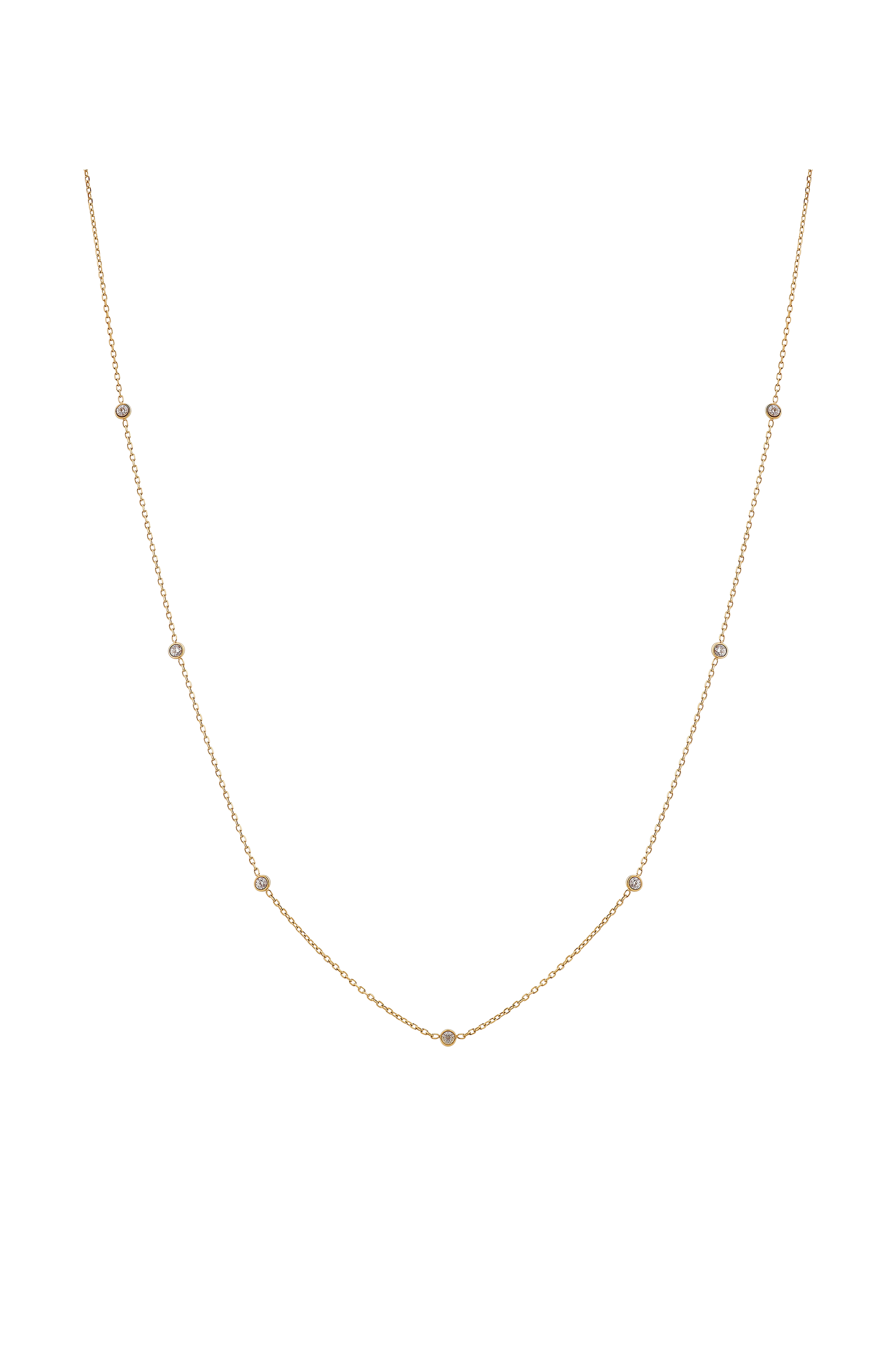 • Halskæde med facetslebet kæde og syv små, runde, funklende sten• Blank 14K guldbelægning på rustfrit stål• Sten i kubisk zirkonia• Nikkelsikkert• Kæde med justerbar længde 42-45 cm• Diameter på stenene 3 mm
