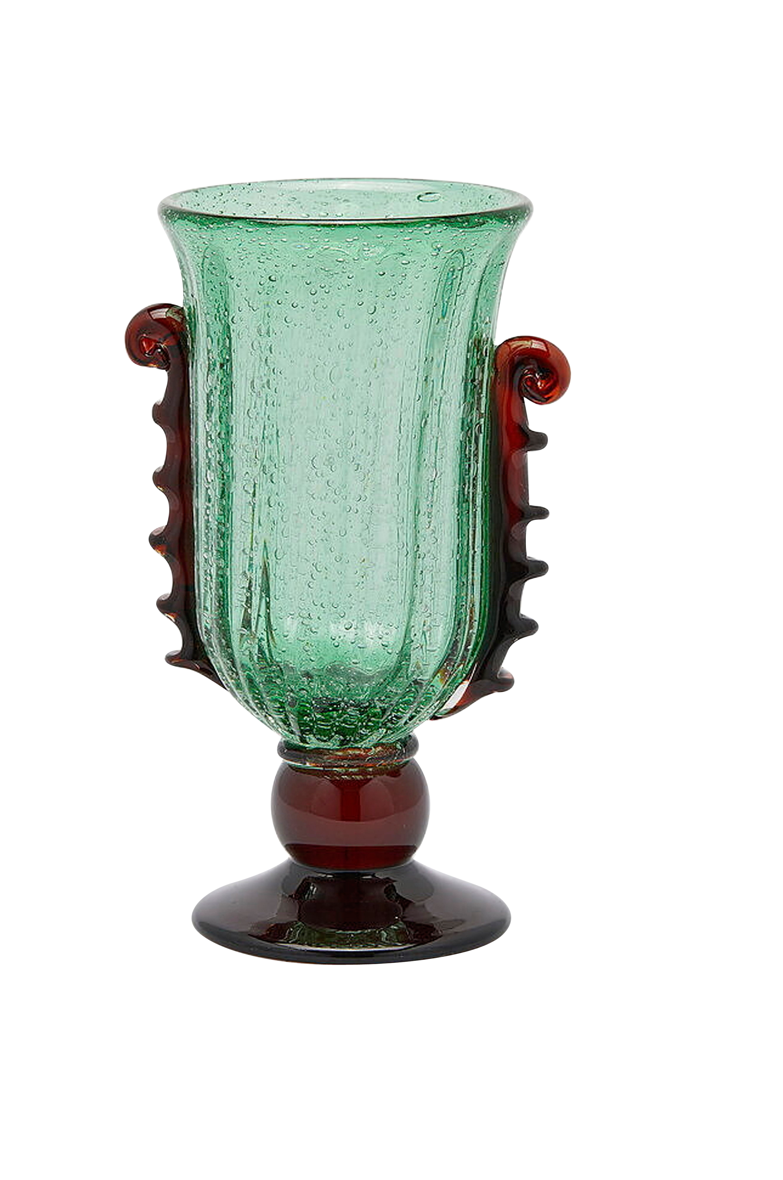 Denne håndlavede glasvase, der er inspireret af det traditionelle design fra Murano i Venedig, viser udsøgt håndværk og tidløs skønhed. Med en højde på 35 cm og en bredde på 22,5 cm giver den et elegant og klassisk touch til ethvert rum.