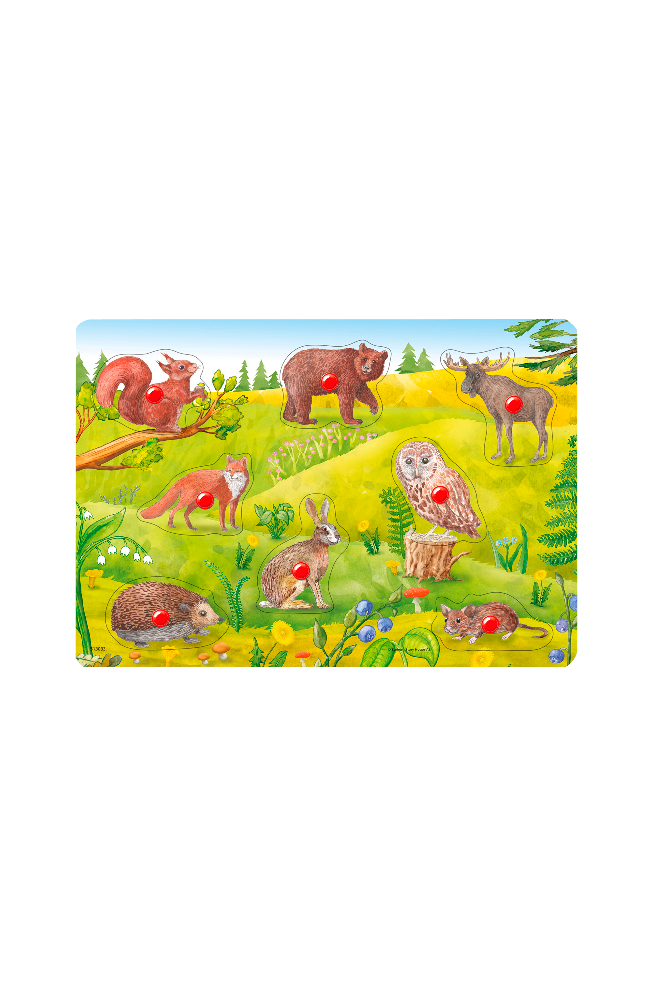 Knoppuslespil med 8 brikker indeholdende skovmotiver med alle børns yndlingsdyr.