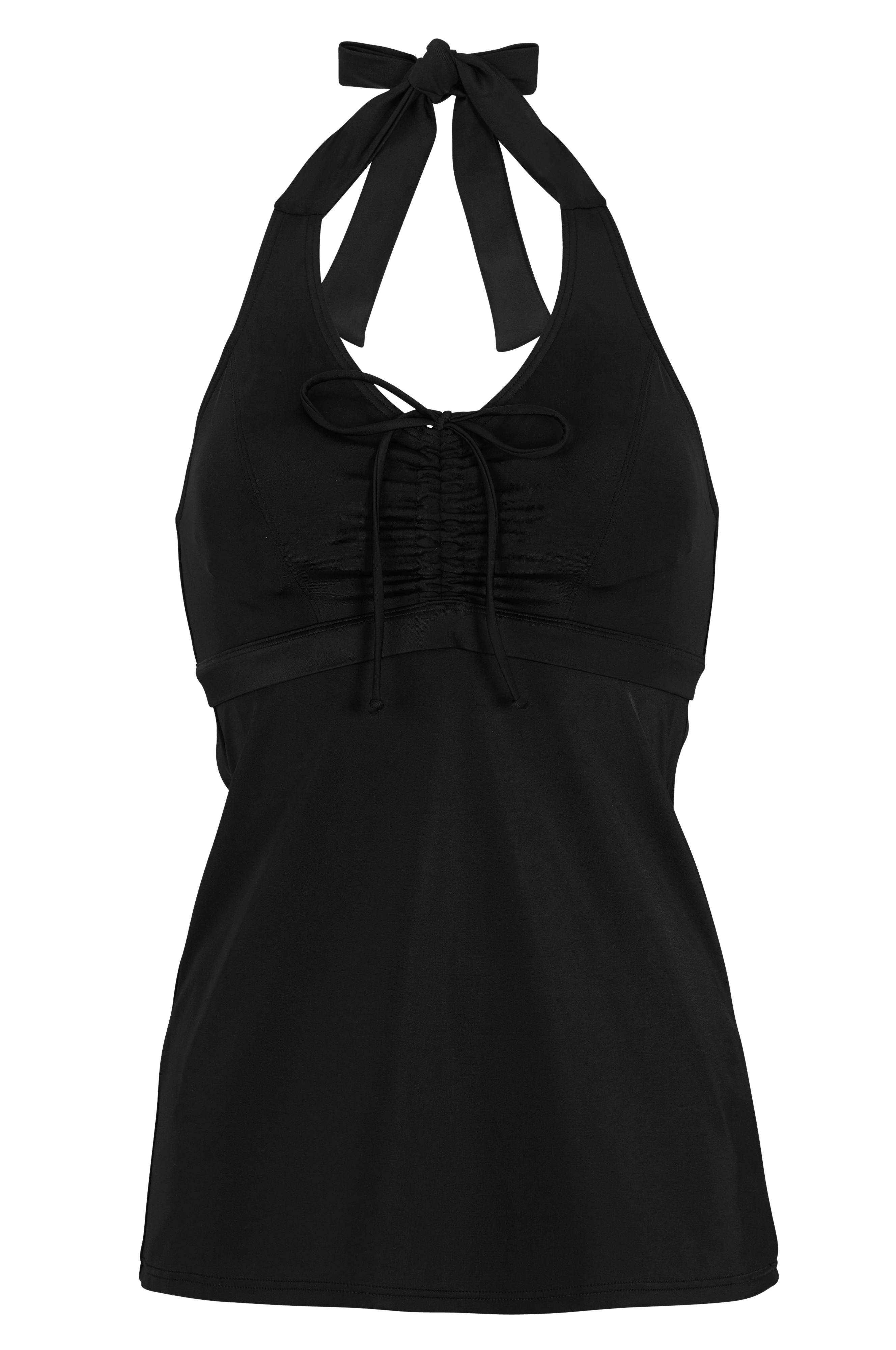 Tankini Jennie i halterneckmodel med brede bånd som bindes i nakken. For med fast materiale som hjælper til at forme og slanke. Udtagelig vattering i skålene. Plastbøjle i siderne. Rynkning mellem skålene med løbegang som bindes foroven. Str. 75C 95C, 75D 100E.