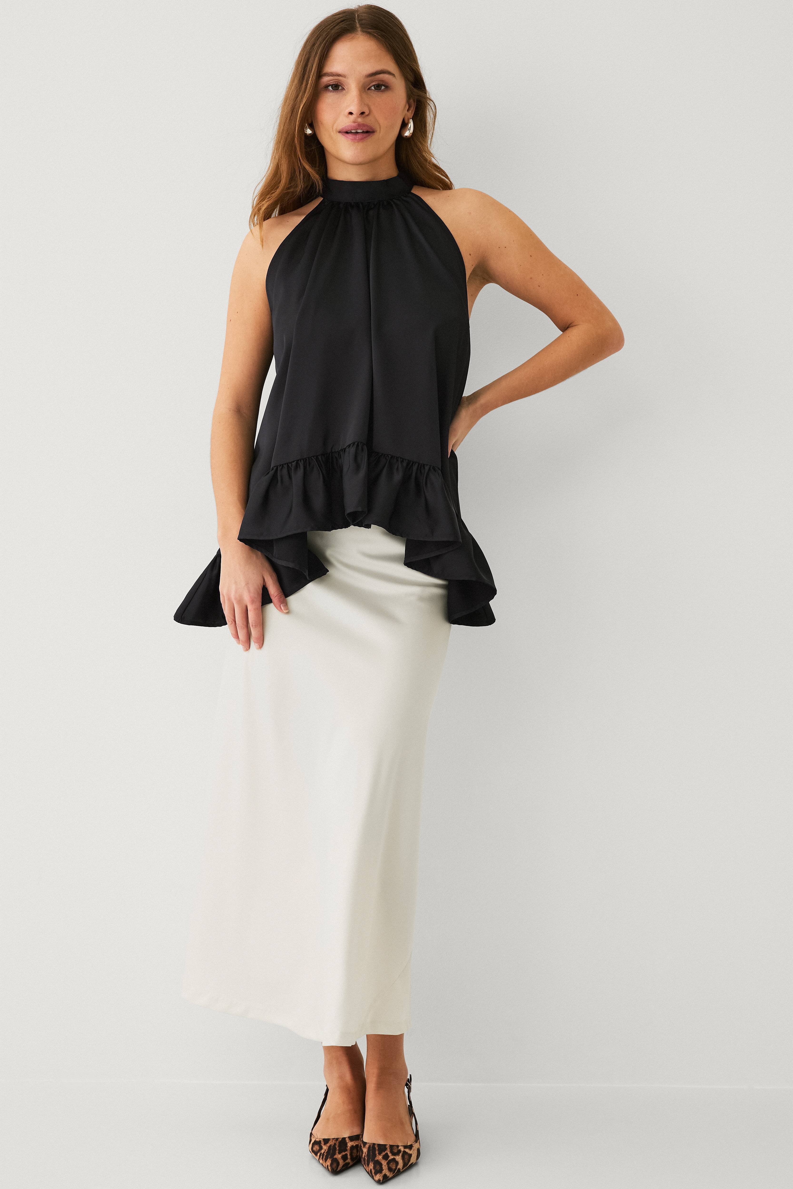 • Bred model med svaj i satin• Rynket halsudskæring med påsyet kant og langt bindebånd i nakken• Lynlås i ryggen• Bred volant ved nederste kant• Længde: 65 cm i størrelse S