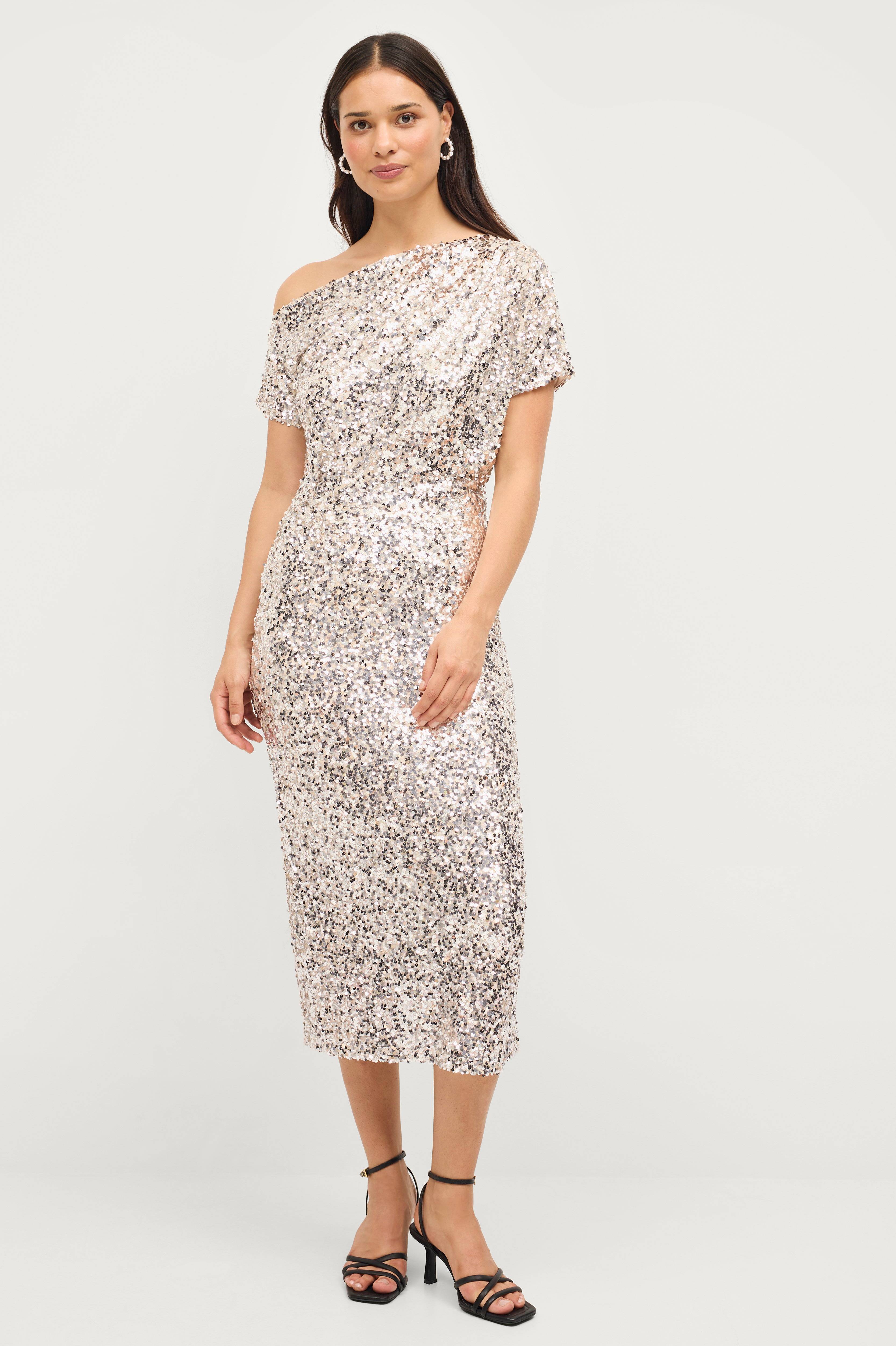 • Store størrelser• Figursyet festkjole• Enskuldret design• Drapering ved skulderen• Elastisk talje• Slids bagpå• Trikotfor• Længde: 134 cm i størrelse 34/36