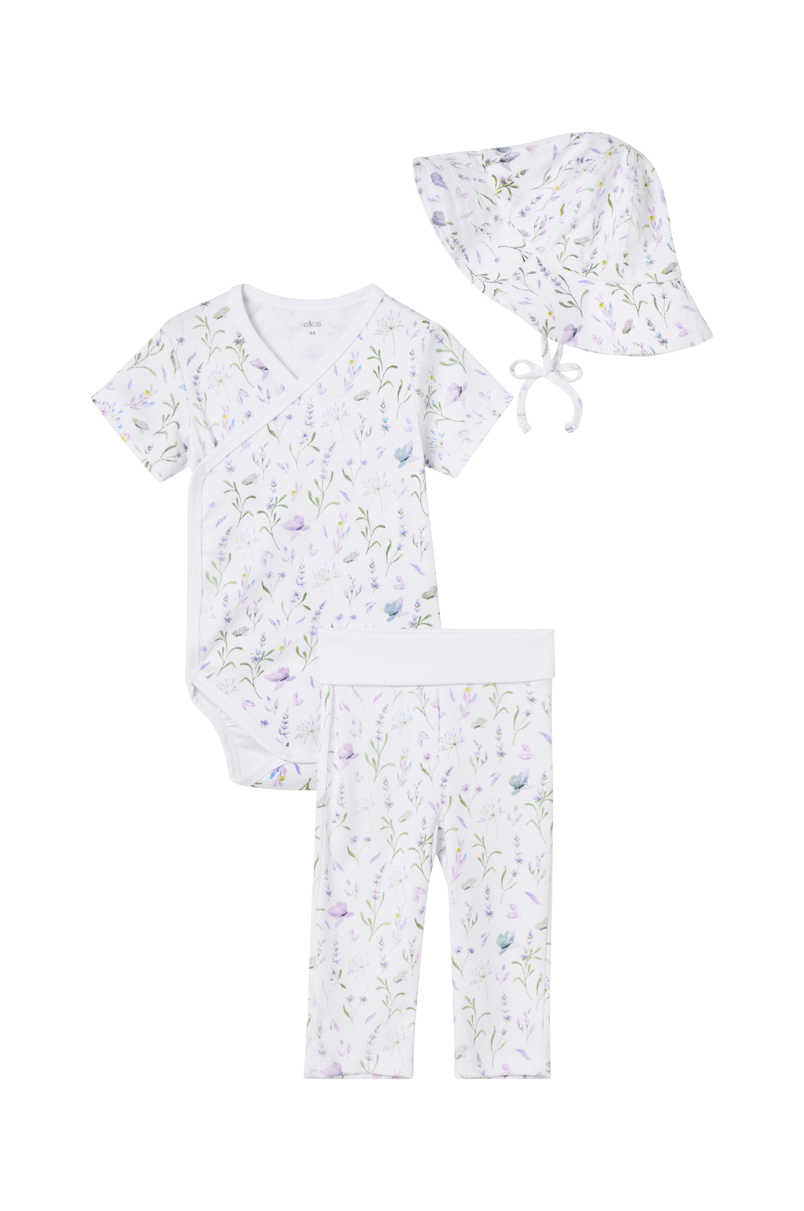 • En kortærmet body med slå-om design og trykknapper i siden og ved skridtet• En bukser med ribbet, elastisk talje• En babyhat med bindebånd under hagen