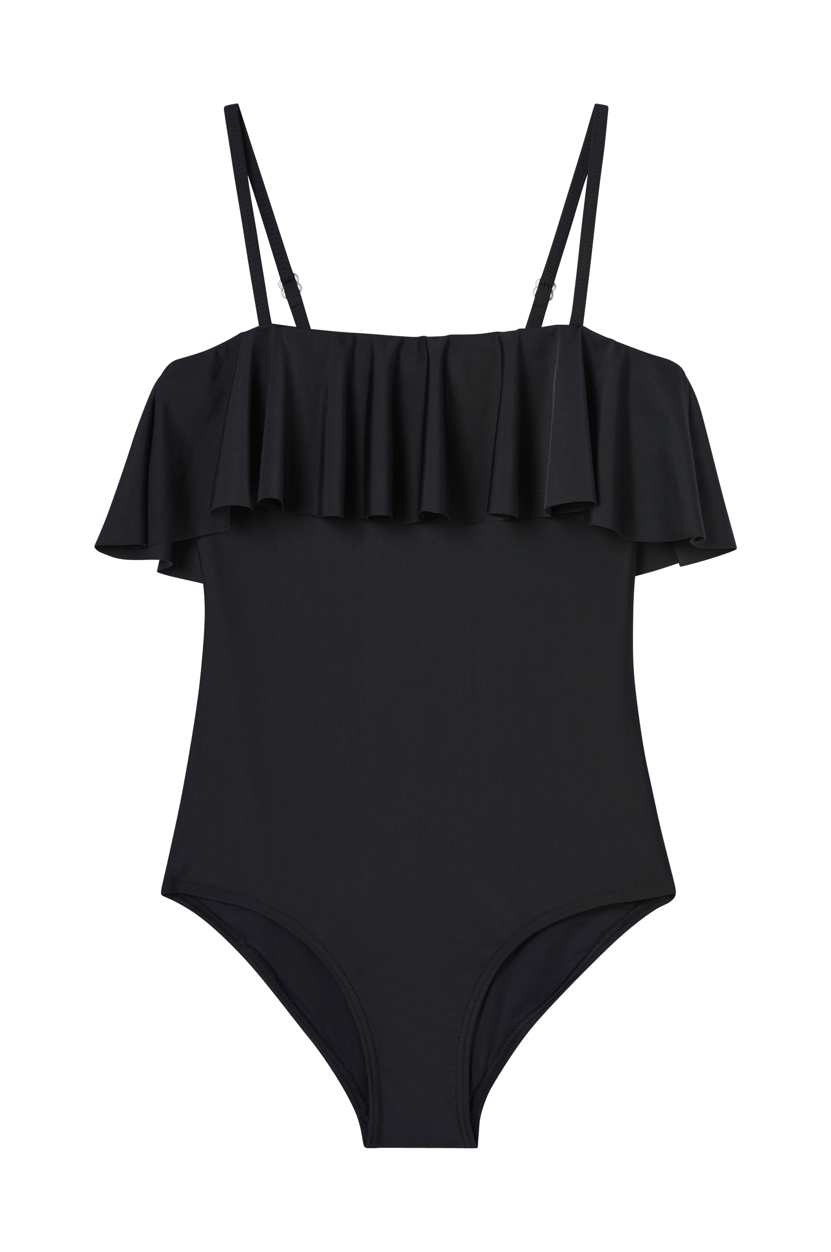 • Foret badedragt med flæselag på toppen• Justérbare, tynde skulderstropper