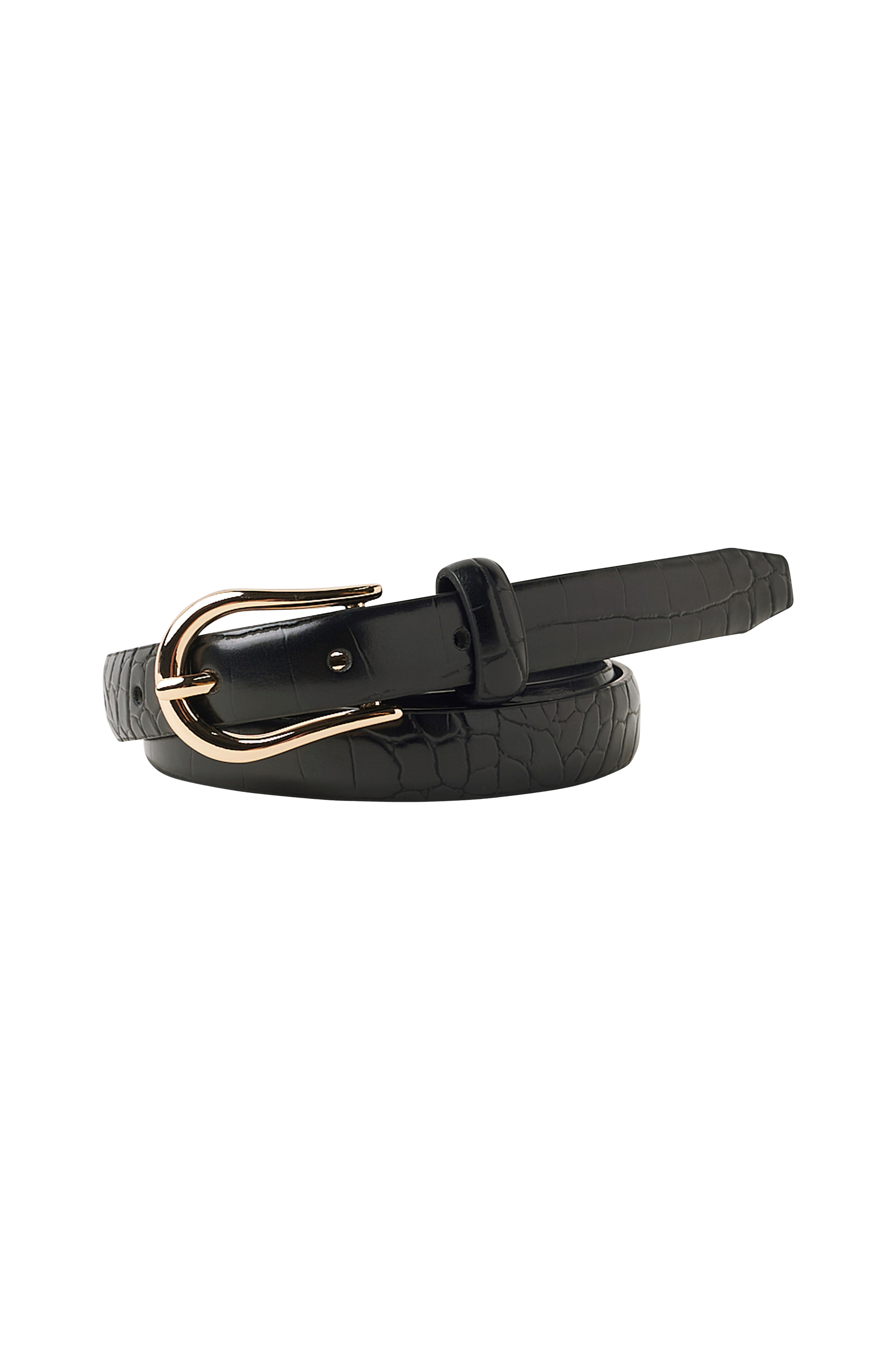 • Bælte i imiteret læder med et krokodillemønster• Guldfarvet spænde• Mål: B 1,8 cm