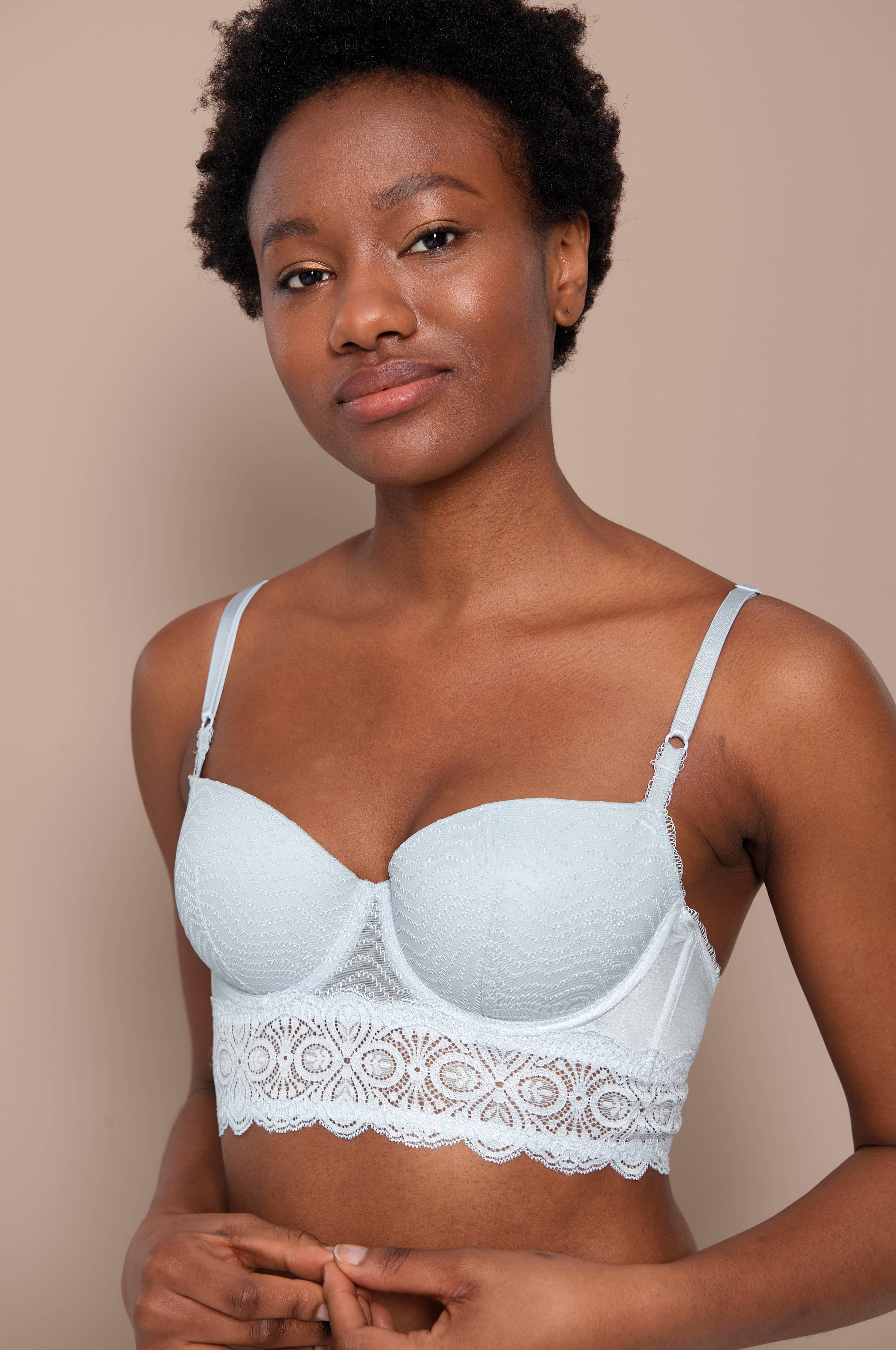 Balconette-bh med bøjle og let vatterede skåle. Ekstra bred blondekant forneden og stabiliserende bøjler i siderne for ekstra støtte. Justerbare skulderstropper og ekstra bred hægte- og mallelukning i ryggen.