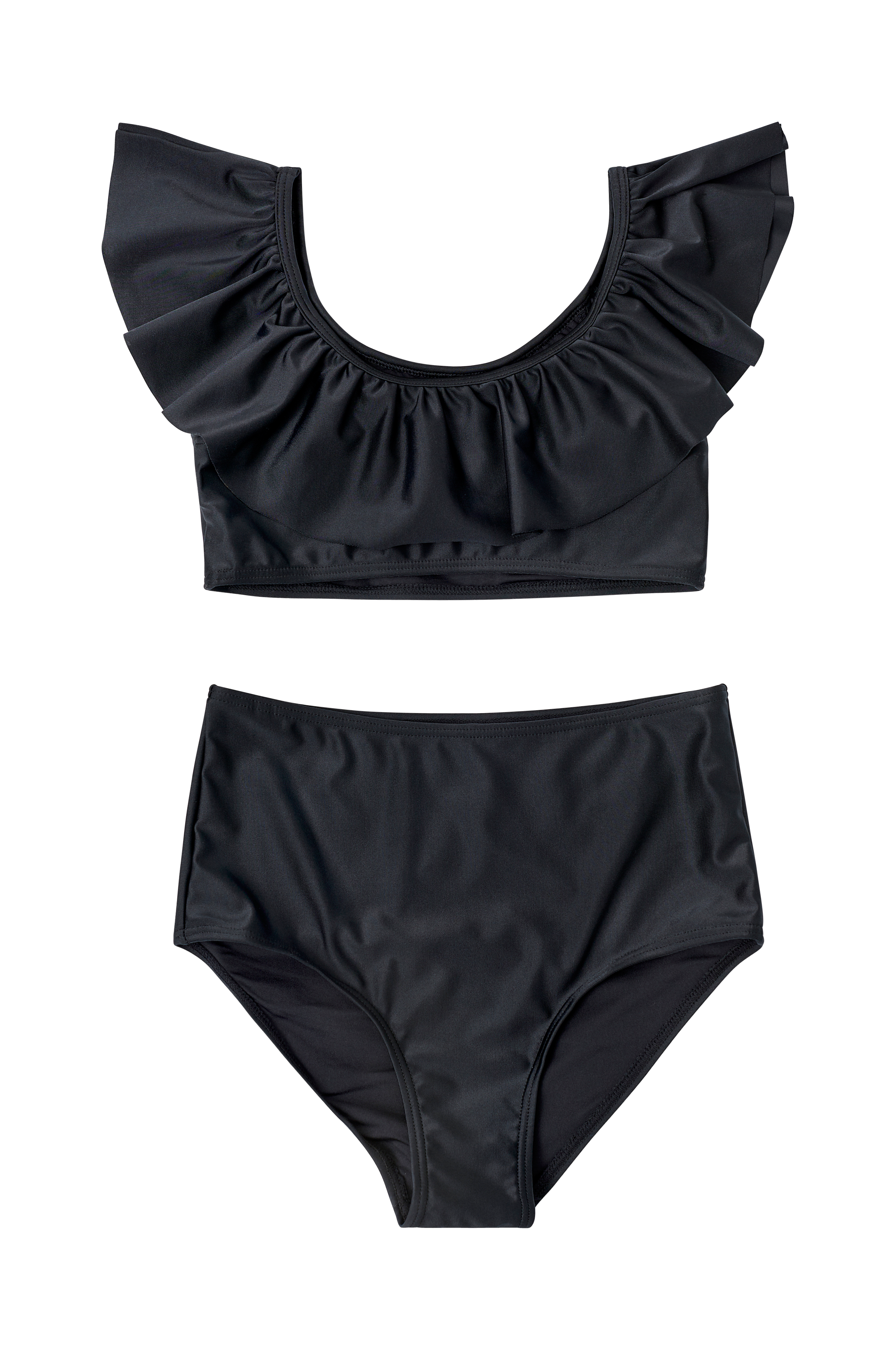 Bikini Noemi i to dele. Bikinitop med bred flæse foroven rundt om og smal elastik forneden. Bikinitrusse i høj hipstermodel med brede sider. Helforet.