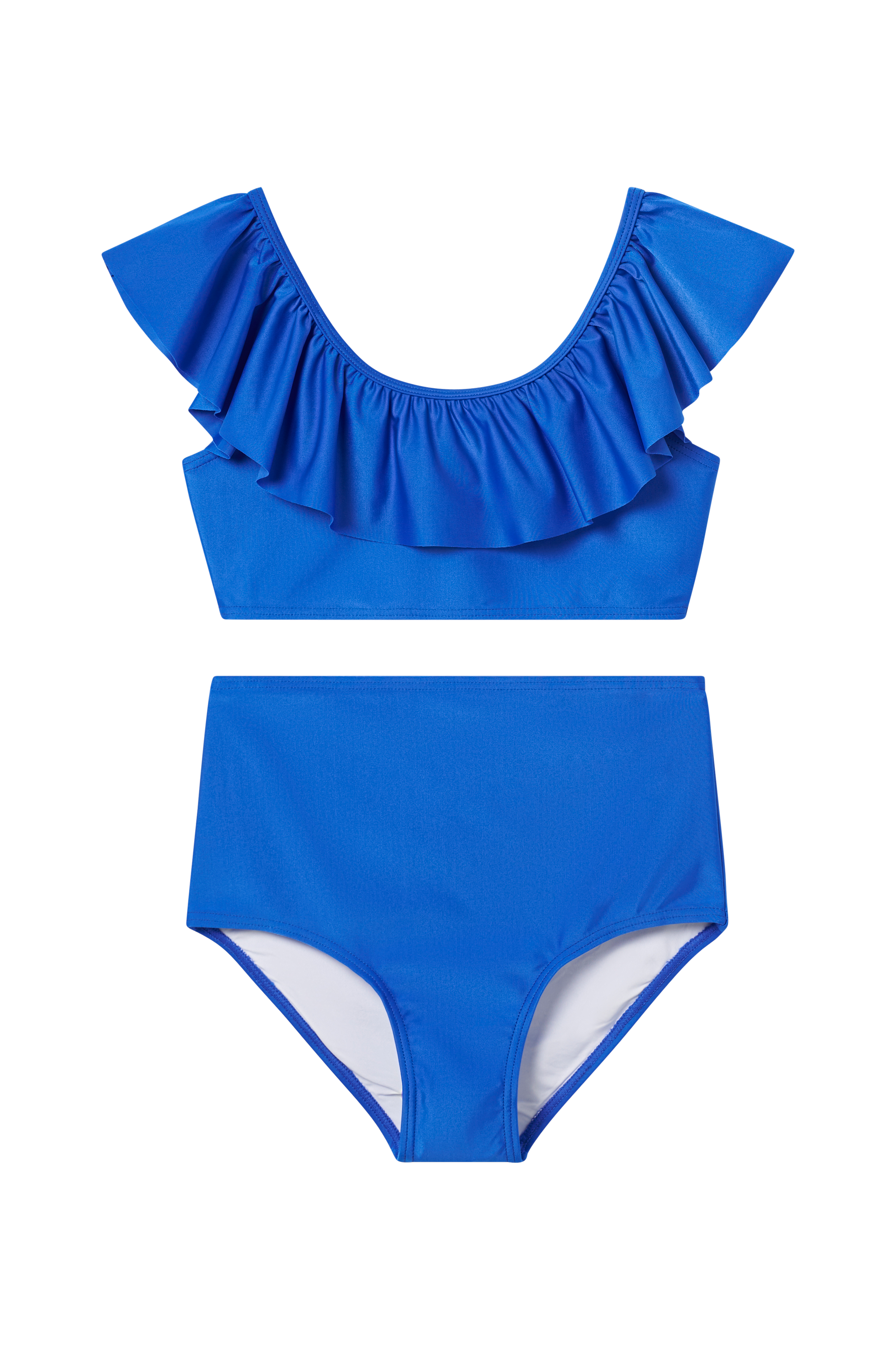 Bikini Noemi i to dele. Bikinitop med bred flæse foroven rundt om og smal elastik forneden. Bikinitrusse i høj hipstermodel med brede sider. Helforet.