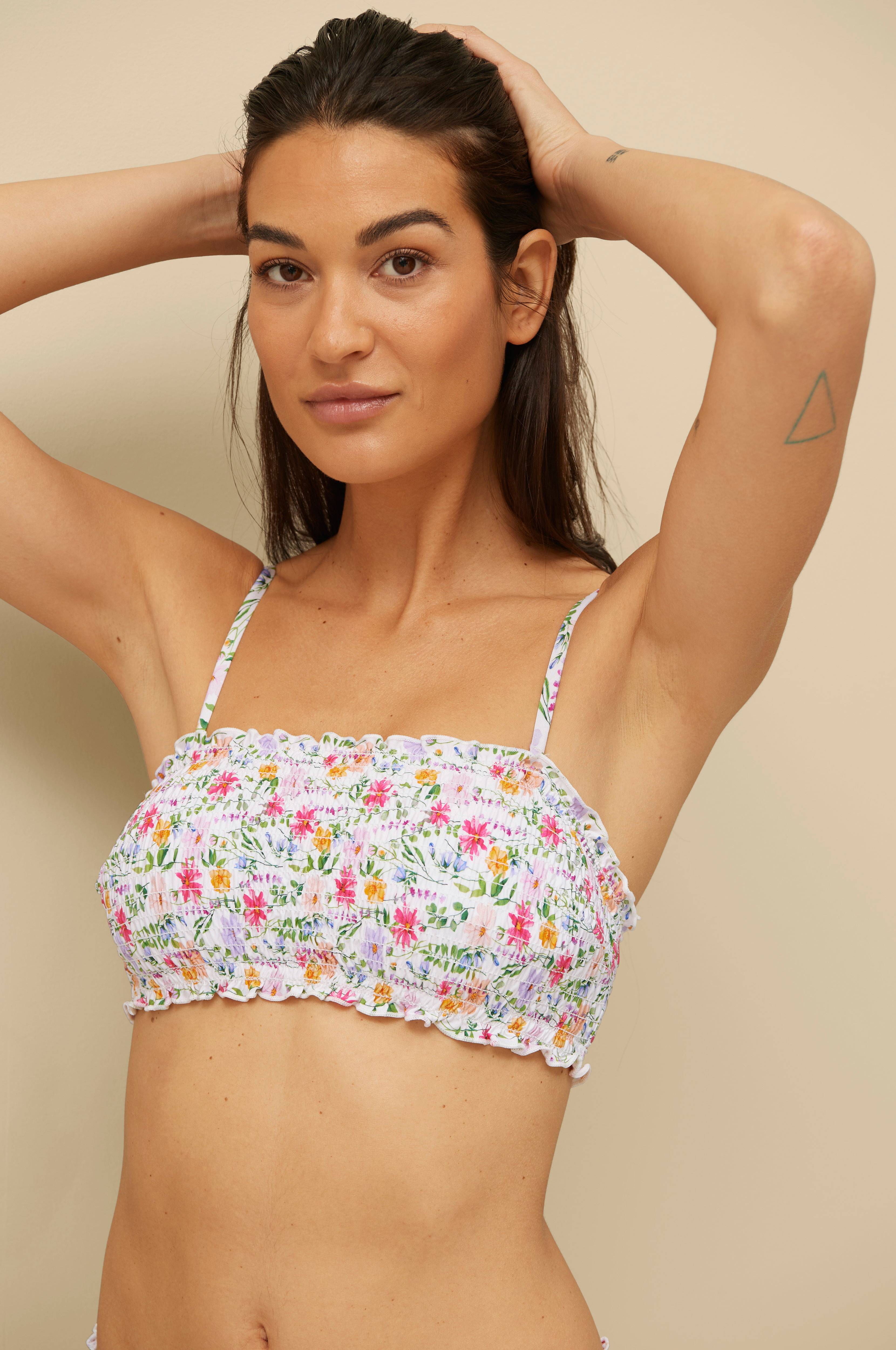 • Smocket bikini-bh i polyamid-blanding med aftagelig polstring• Justérbare, tynde, aftagelige skulderstropper• Træk på model• Indvendig silikonekant giver god pasform selv uden skulderstropper