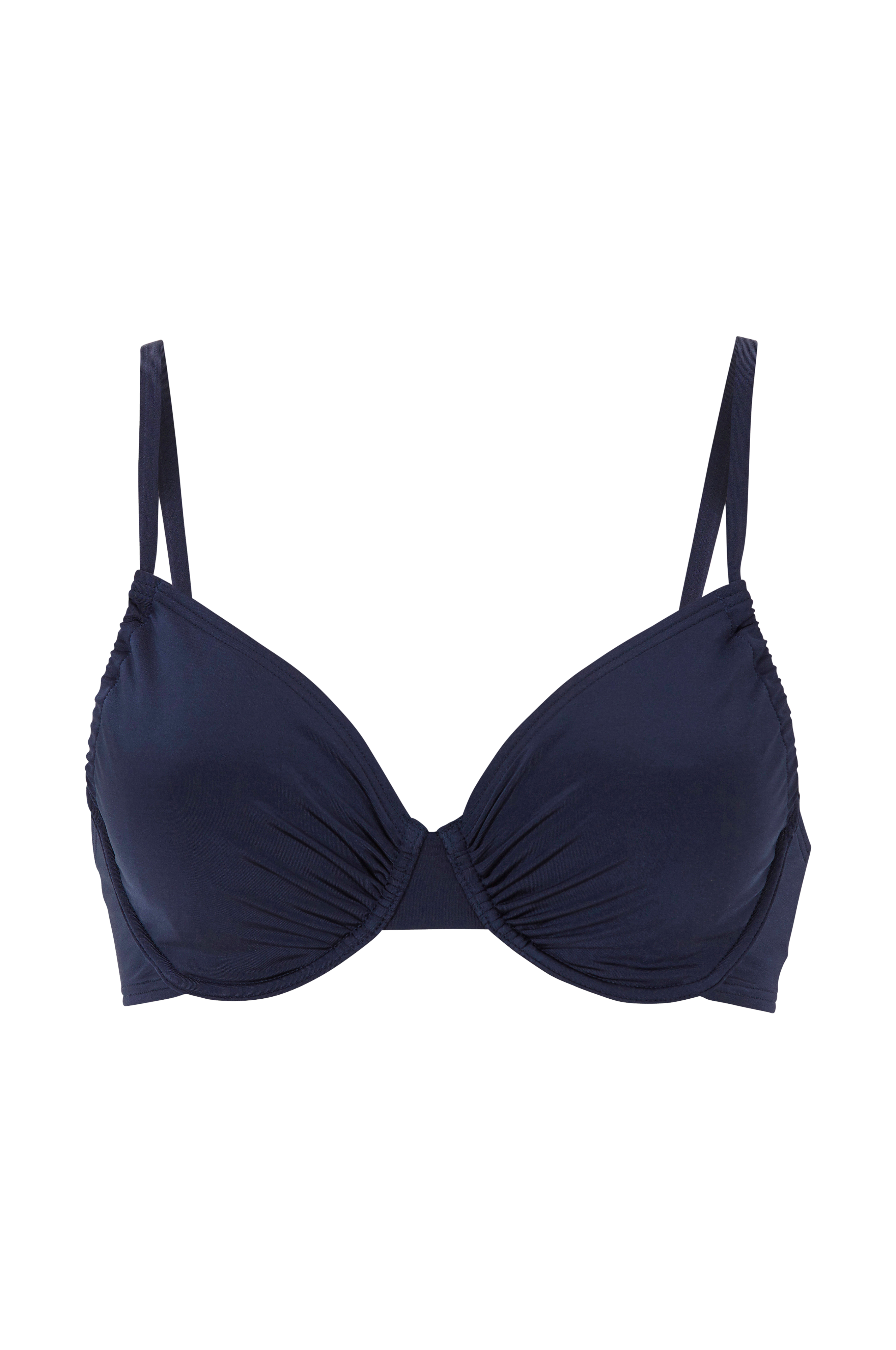 Bikinitop Louise med bøjle og tynde, forede skåle. Lukkes med spænde i ryggen. Skålens højde i side er justerbar og giver fin rynkeffekt.