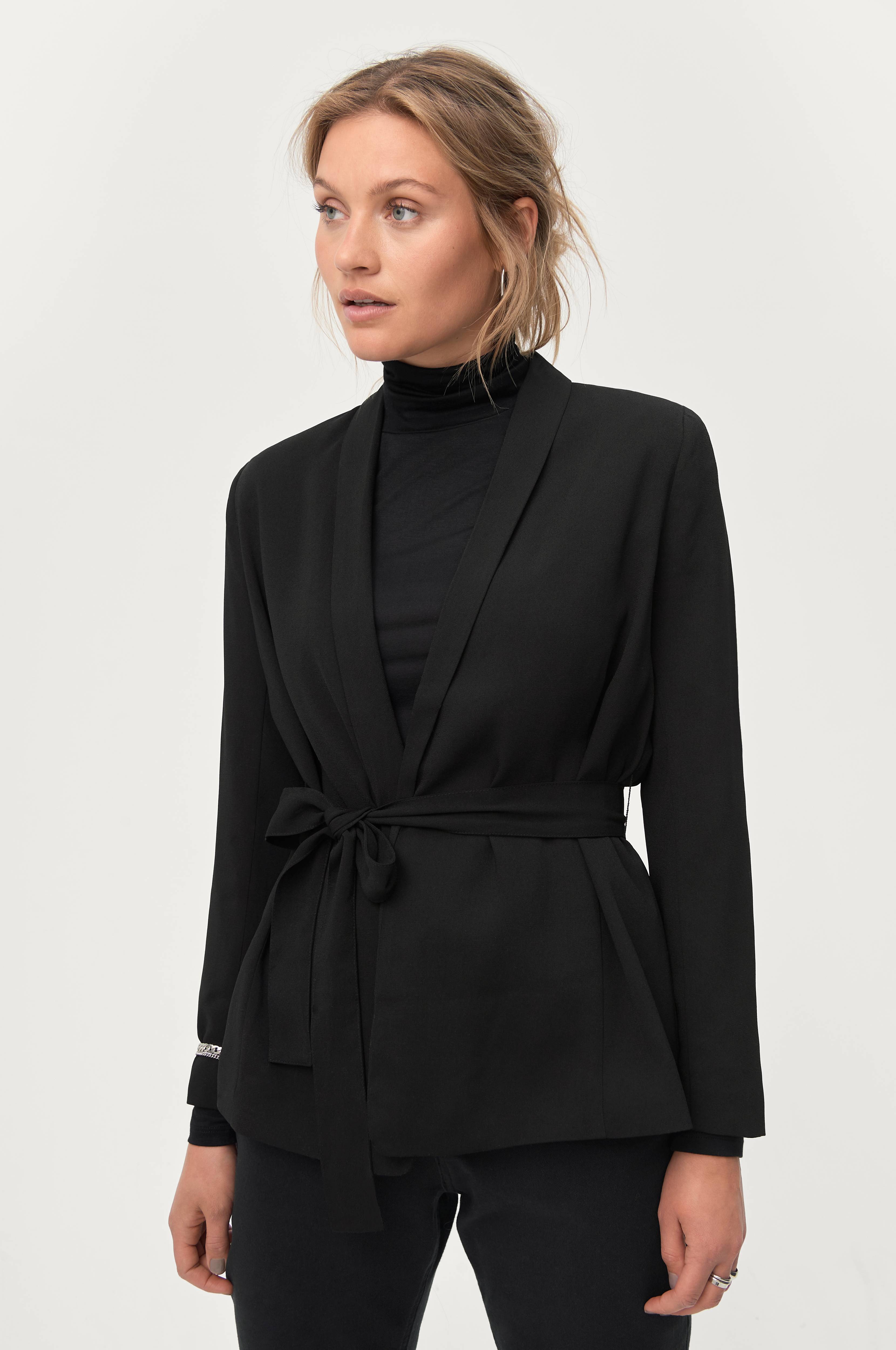 Blazer Line i elegant model uden lukning og med flot sjalskrave. Langt ærme med lille slids i ærmekant og bindebælte i tynde stropper i taljen. Vævet kvalitet med vævet for og tynde skulderpuder. Længde foran ca. 70 cm og bagpå ca. 67 cm i str. 38.