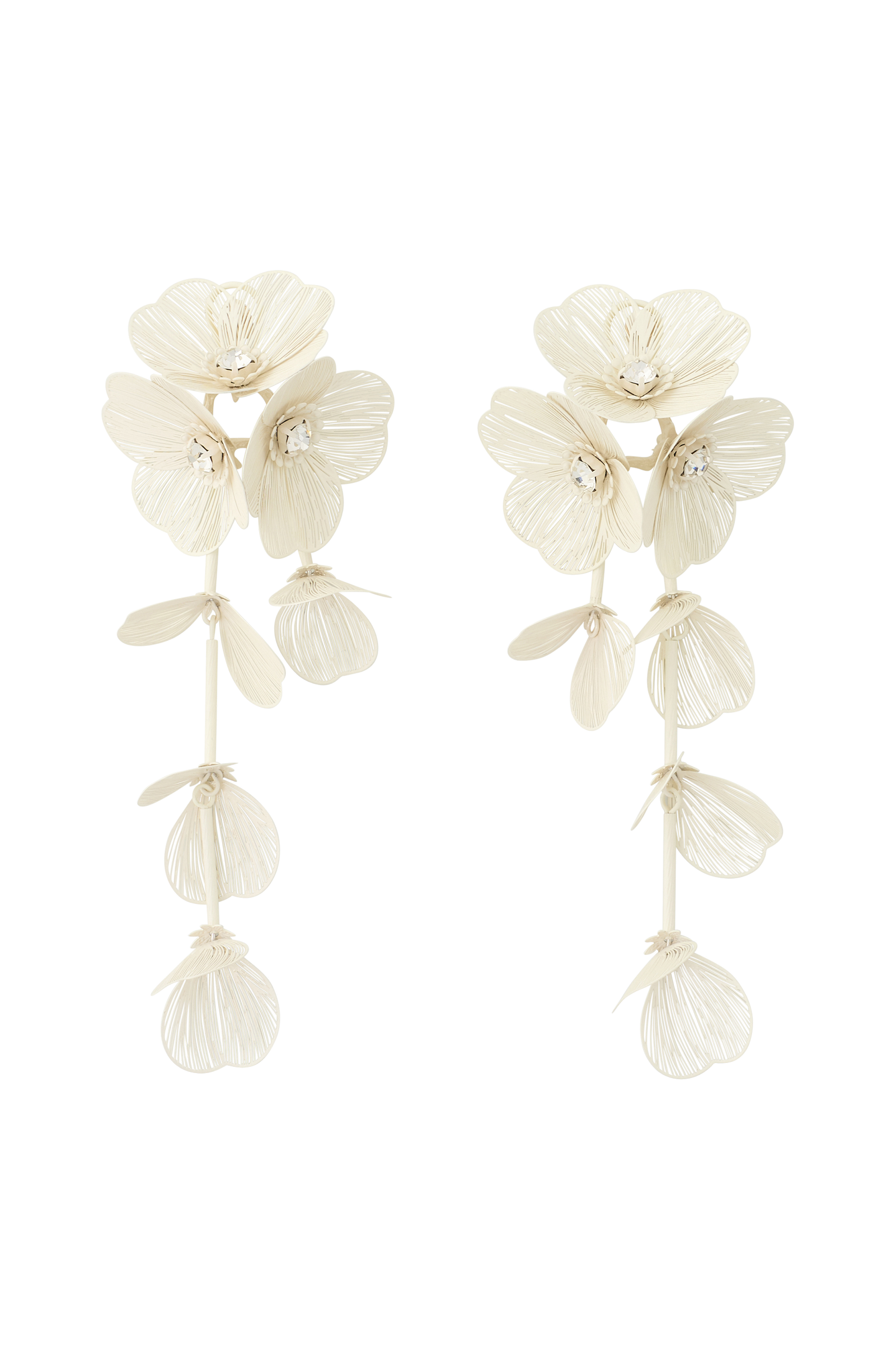 • Blomsterformede ørestikker i messing og zink med funklende rhinstene• Dekorative, hængende kronblade