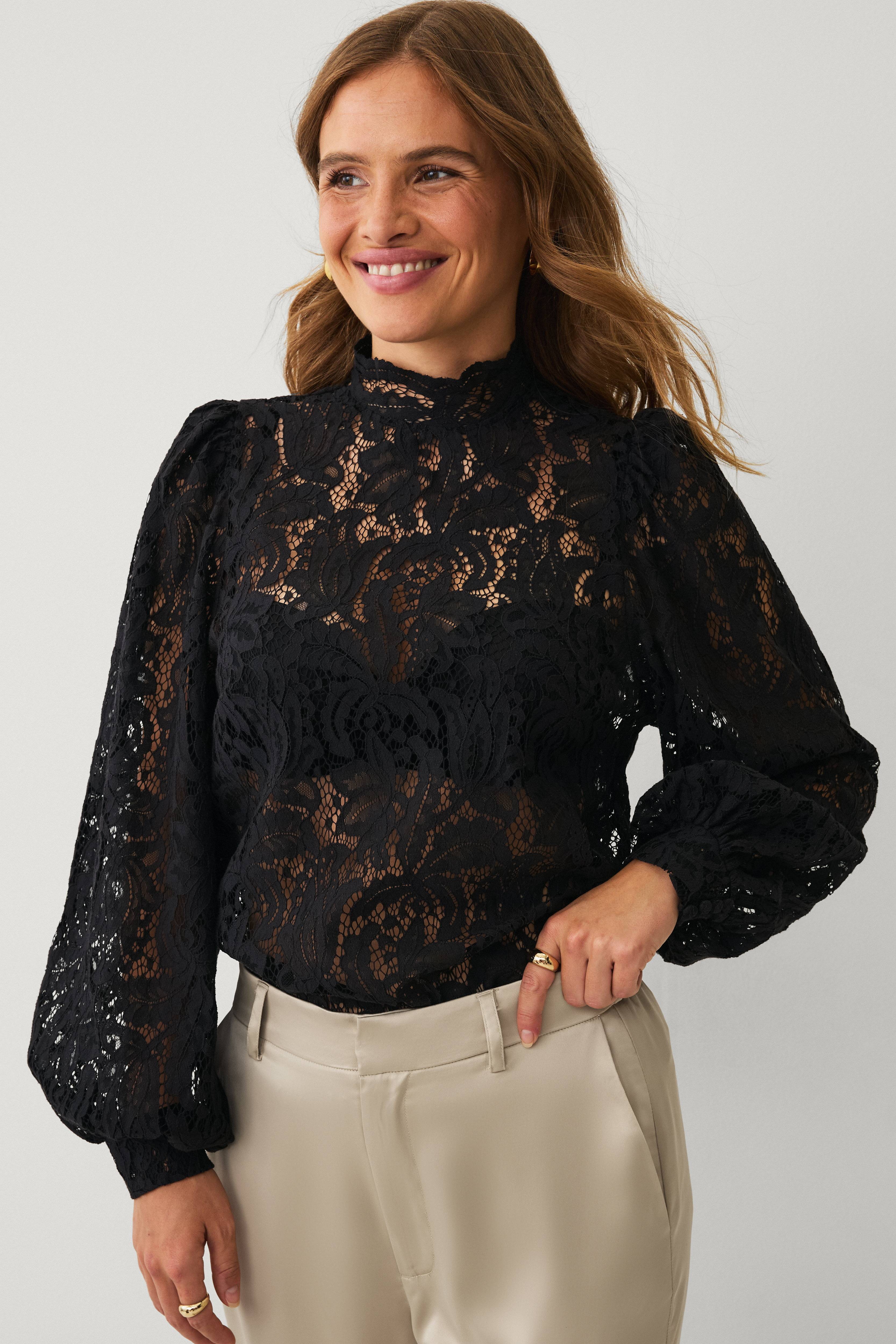 • Transparent bluse i blonde• Høj halsudskæring• Slids med beklædte knapper i nakken• Lange ballonærmer med manchet