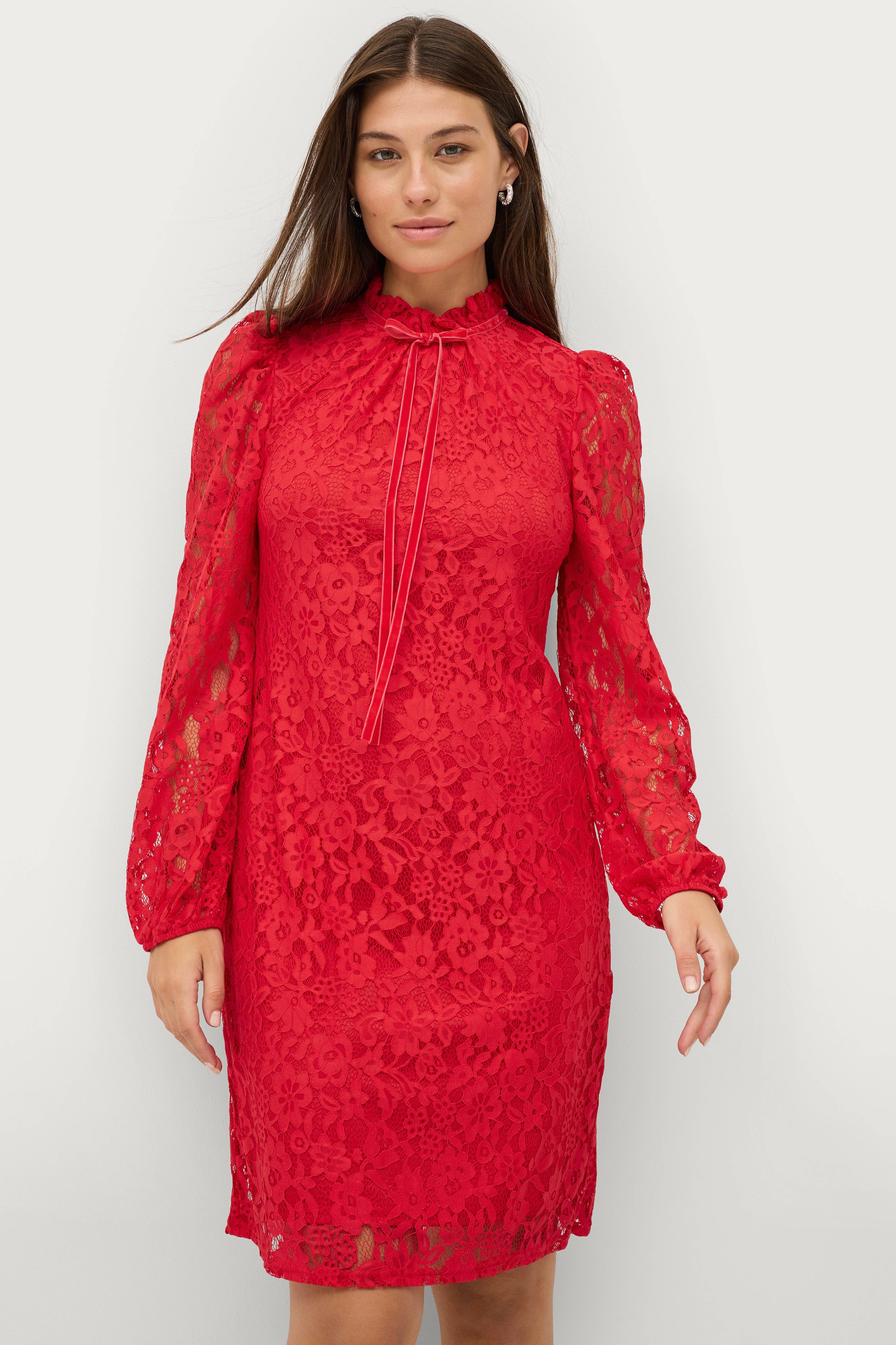 • Figursyet kjole i blonde• Transparente ærmer med elastiske manchetter• Volant i halsen• Bindebånd i fløjl langs udskæringen• Ventilation med knap i nakken• Trikotfor• Længde: 95 cm i størrelse 34/36