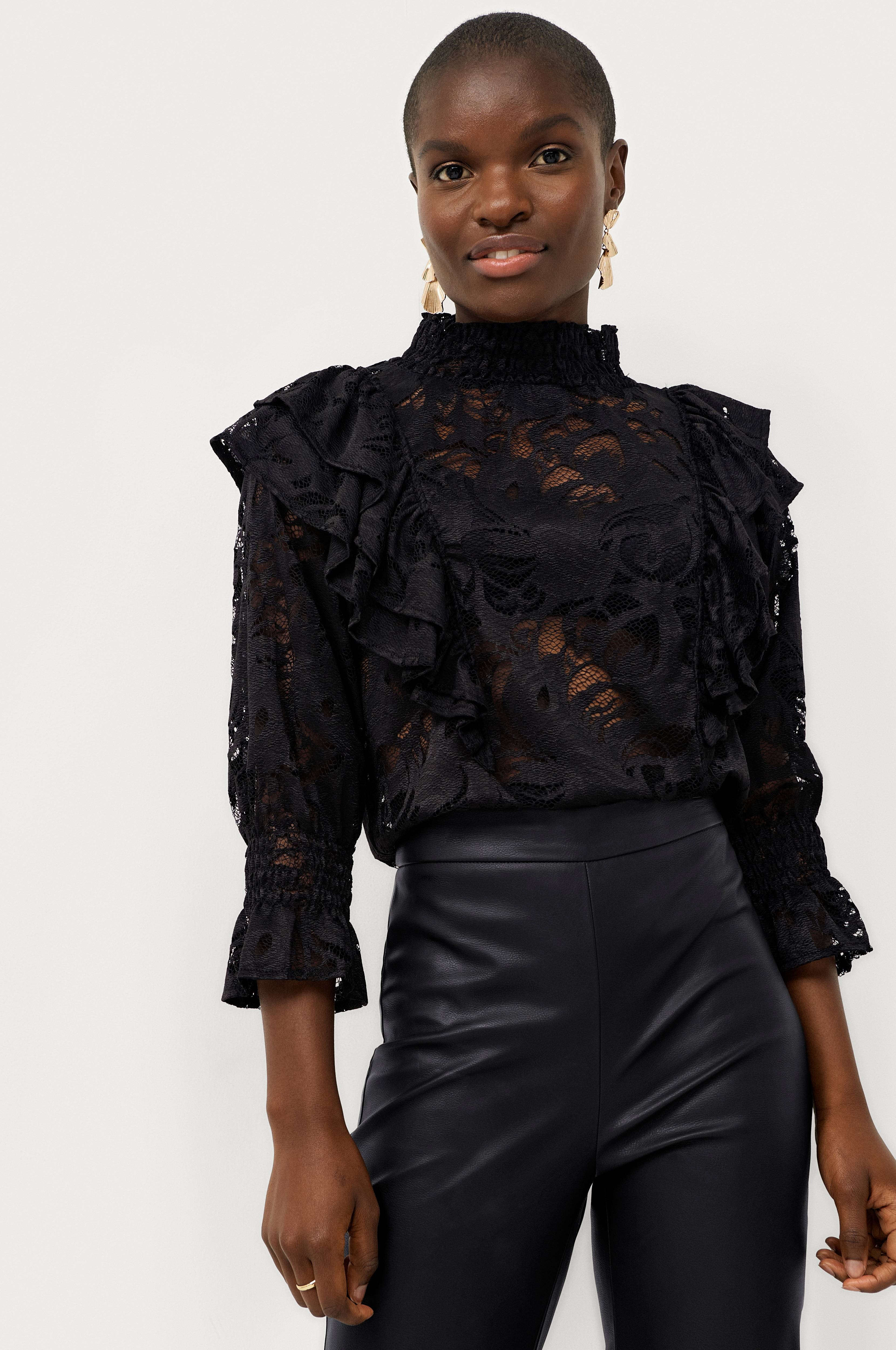 • Høj halsudskæring med smock • 3/4 lange ærmer • Volanter på skuldrene • Fremstillet af transparent blonde med stræk • Længde: 63 cm i størrelse 34/36