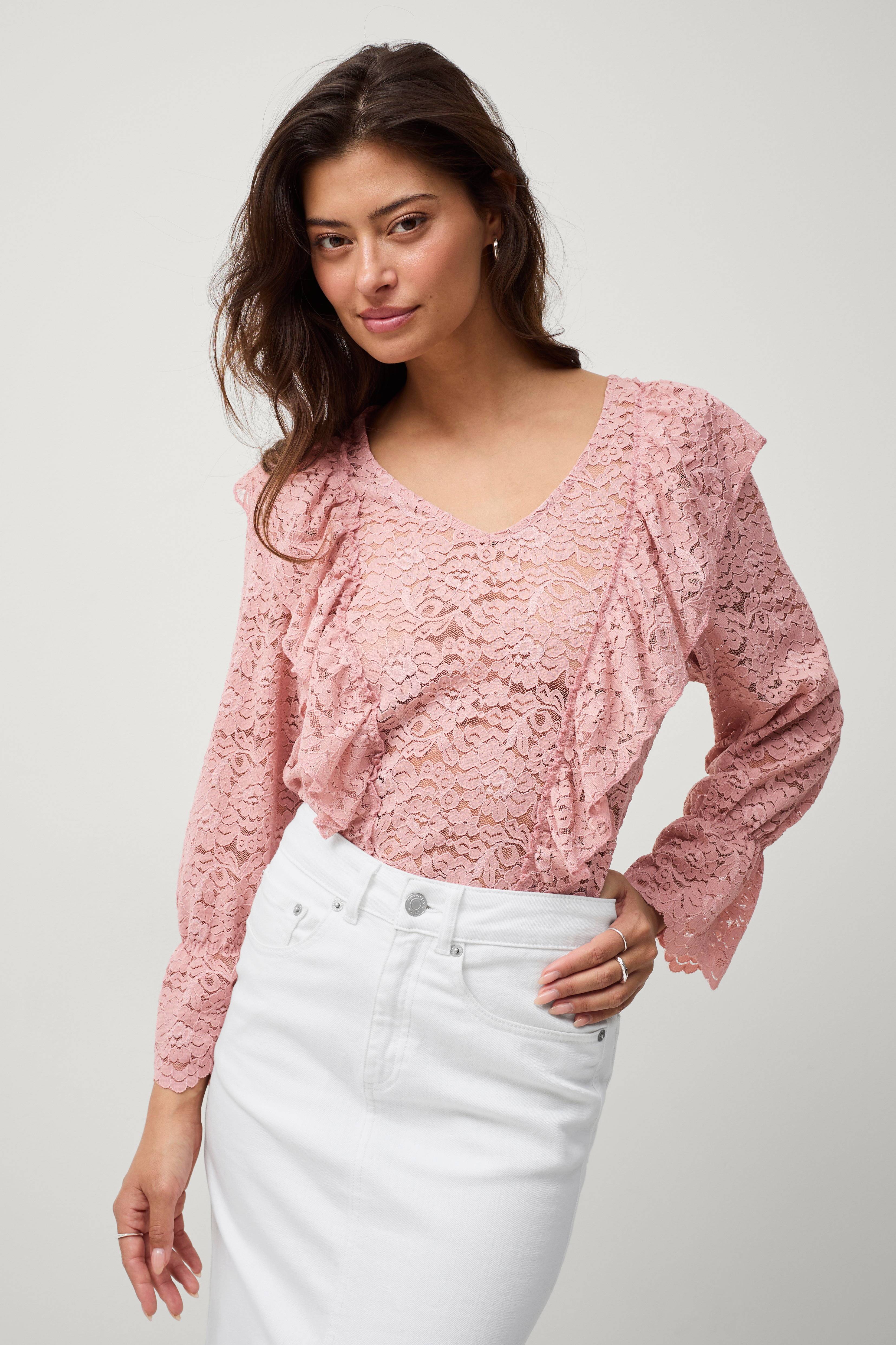 • Top i elastisk, transparent blonde• V-udskæring• Volanter foran, over skuldrene og bagpå• Lange ærmer med volant ved manchetterne• Længde: 60 cm i størrelse 34/36