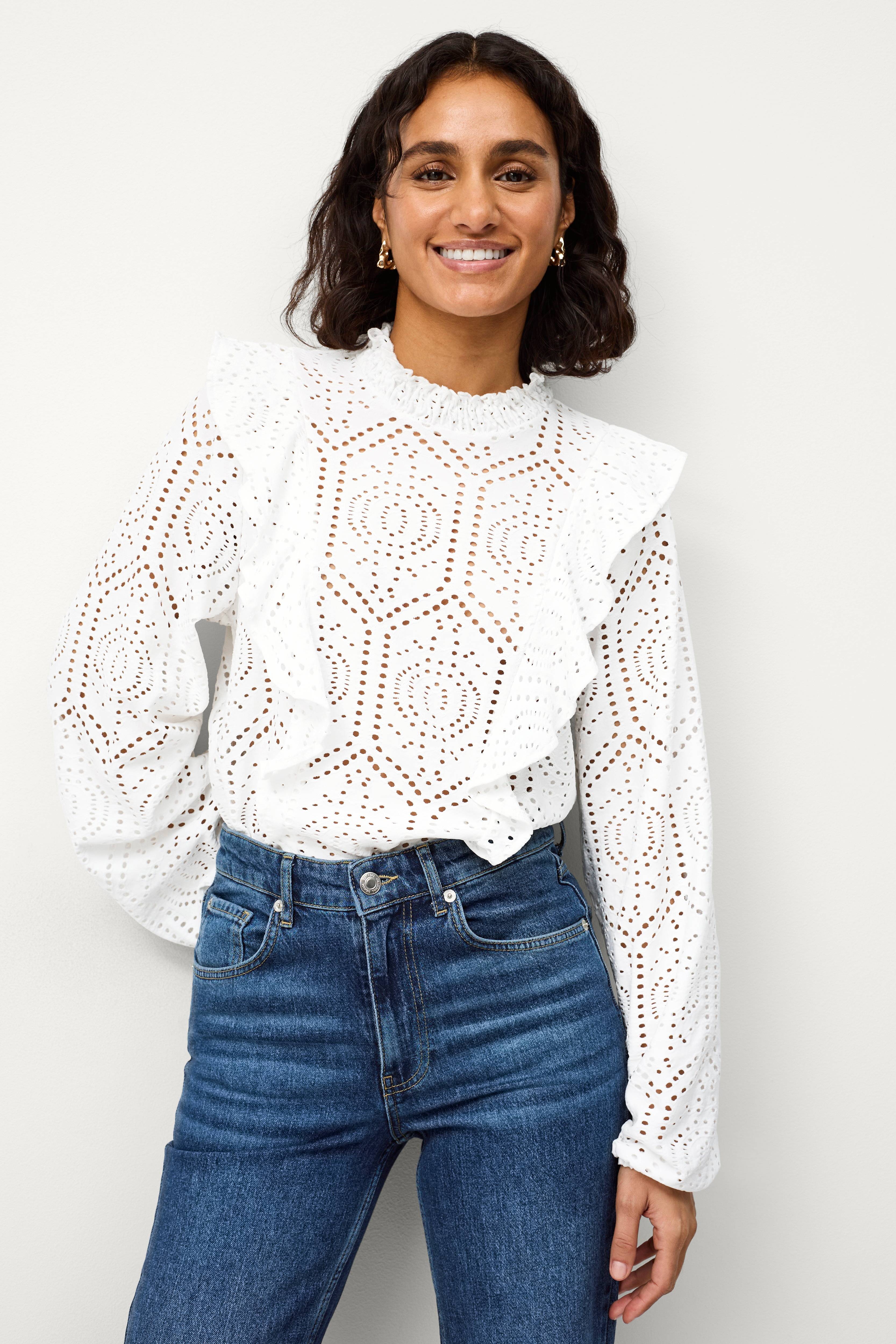 • Top med broderet hulmønster • Volanter over skuldrene • Elastisk bånd ved manchetterne • Smock i halsen • Længde: 60 cm i størrelse 38/40 • Produktet er GRS-certificeret, hvilket betyder, at det indeholder sporbart genindvundet materiale og opfylder GRS' miljømæssige og sociale krav til ansvarsfuld produktion gennem hele fremstillingsprocessen. Samtidigt får gamle ressourcer nyt liv i stedet for at der forbruges nye. Licensnummer og testinstitut: H08642 Intertek