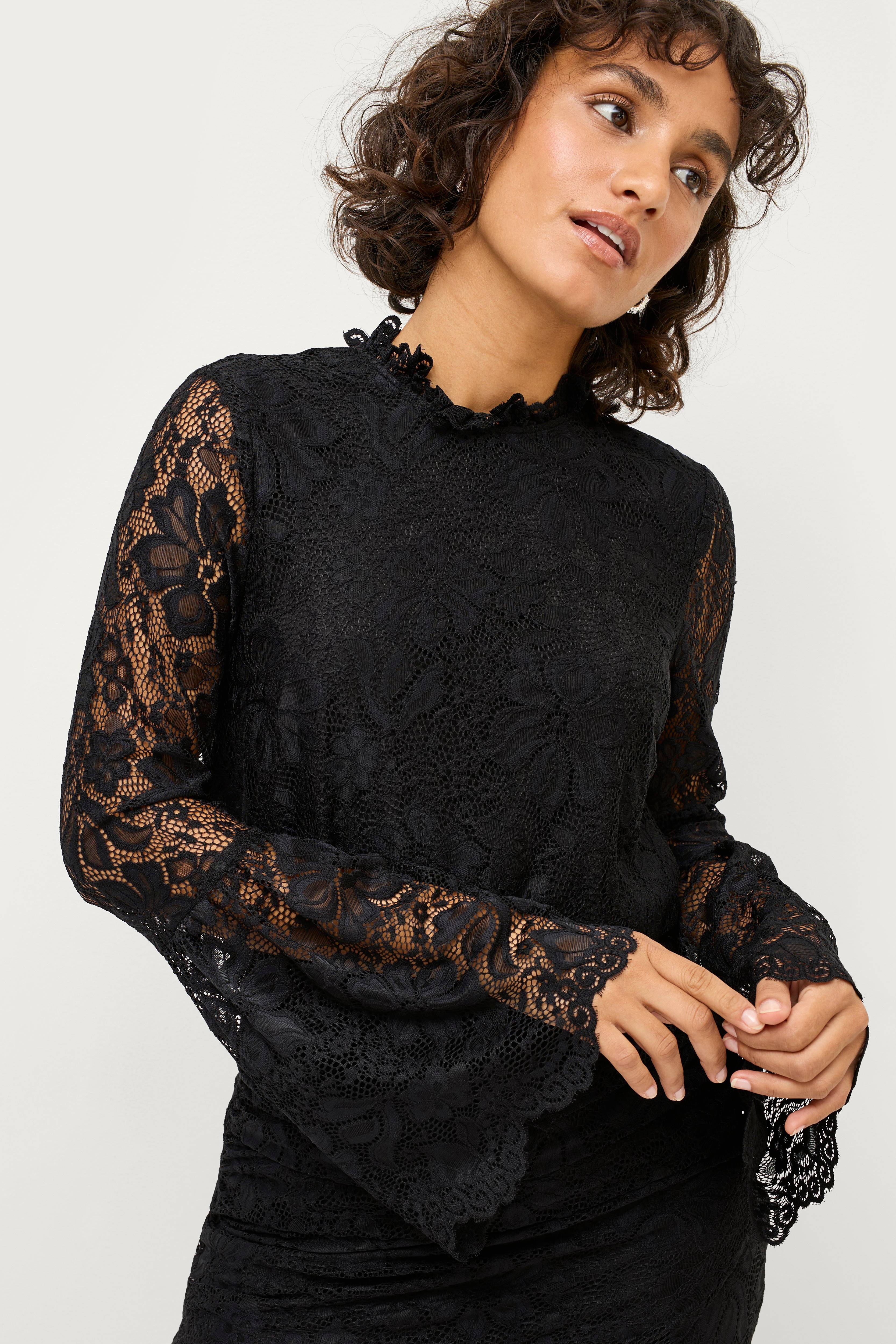 • Top i transparent, elastisk blonde• Uigennemsigtigt, elastisk for• Lange, uforede trompetærmer• V-formet halsudskæring• Lidt længere bagtil• Længde: 62 cm i størrelse 38/40