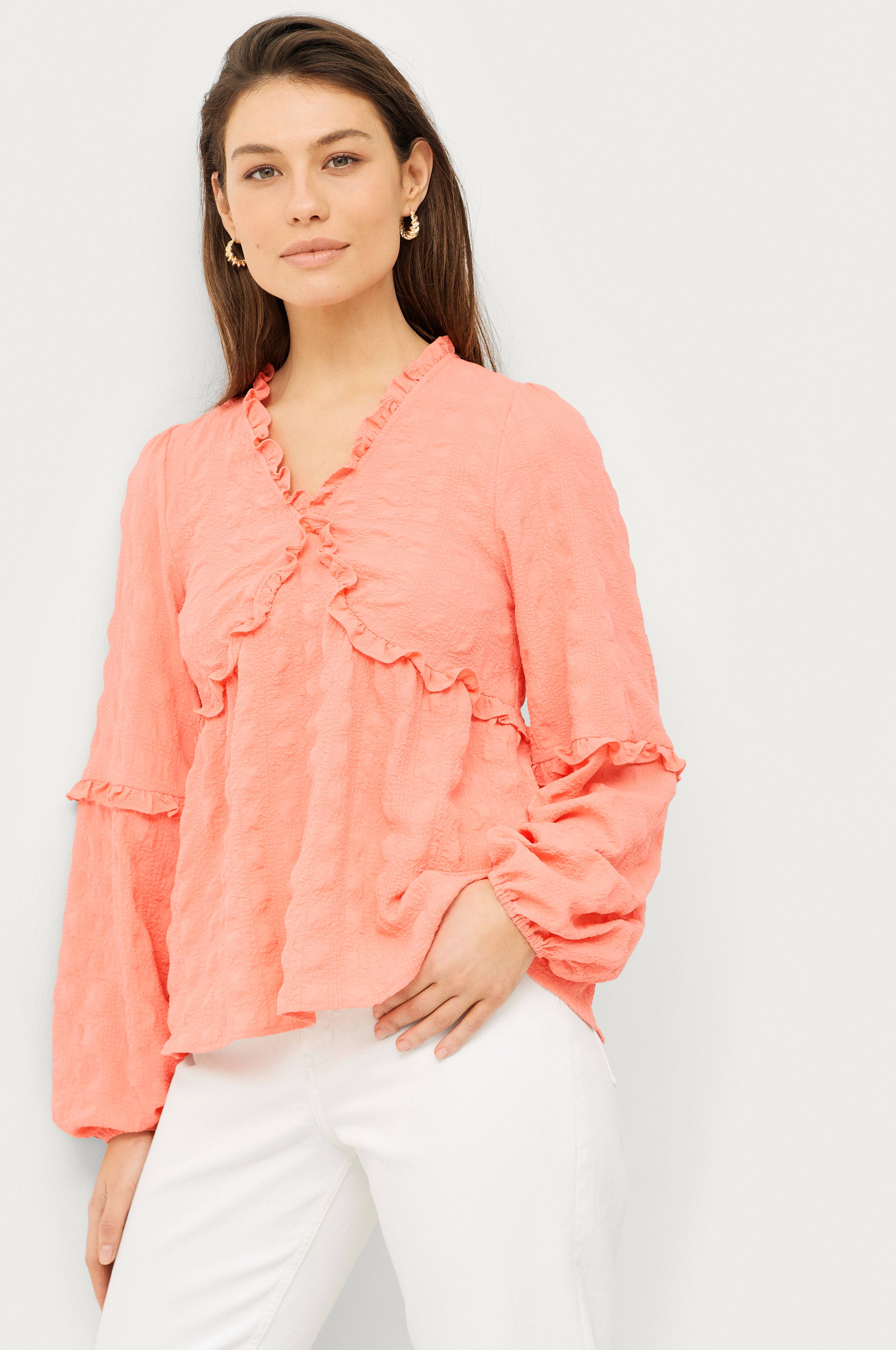 • Model med en uformel pasform • V-formet halsudskæring med volant • Lille volant hele vejen rundt • Bredt ballonærme med elastisk manchet • Længde: 64 cm i størrelse 34/36