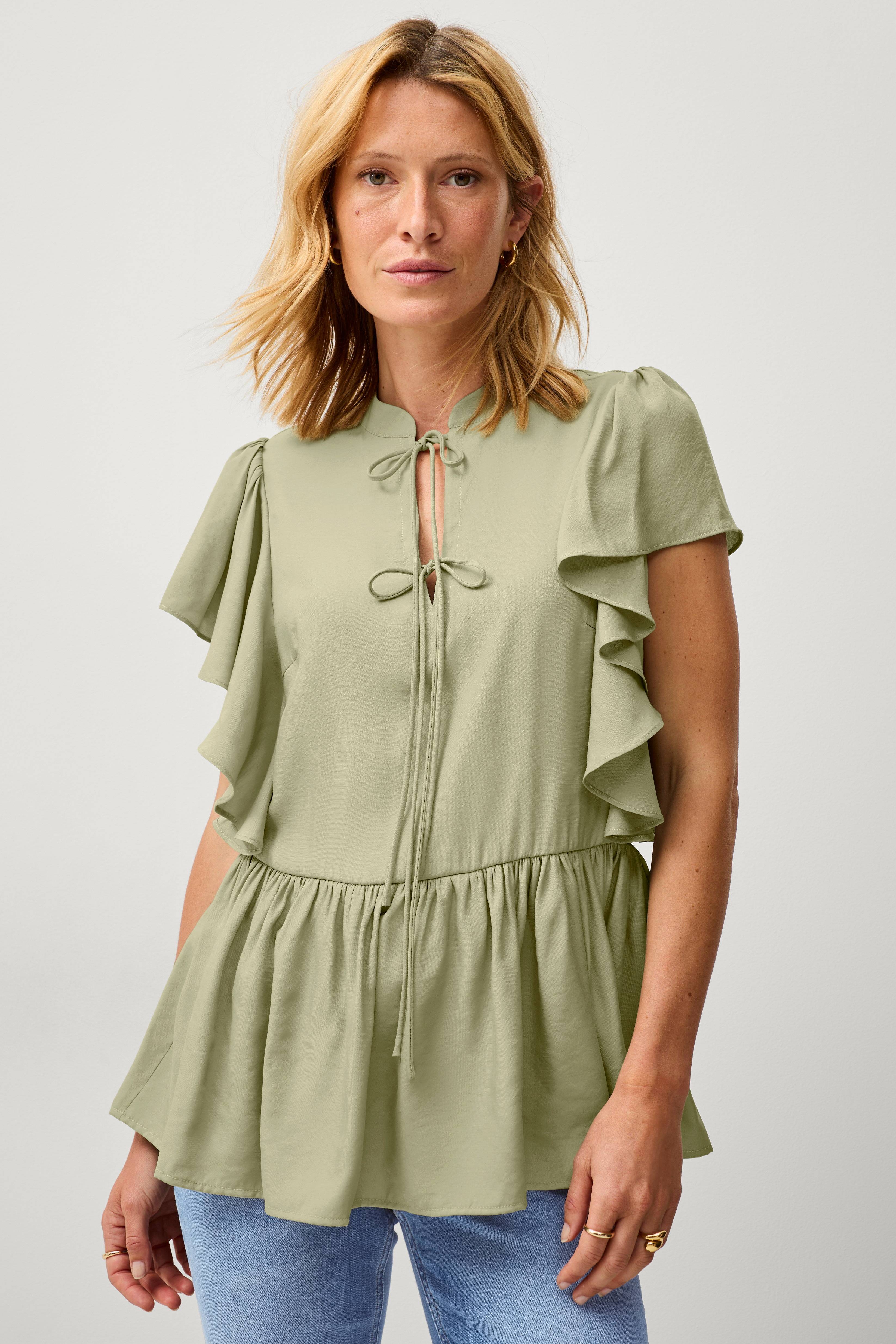 • Peplumdesign• Påsyet kant i halsen med ventilation og bindebånd foran• Bred volant over skuldrene• For en løsere pasform anbefaler vi at gå en størrelse op• Længde: 72 cm i størrelse 34/36
