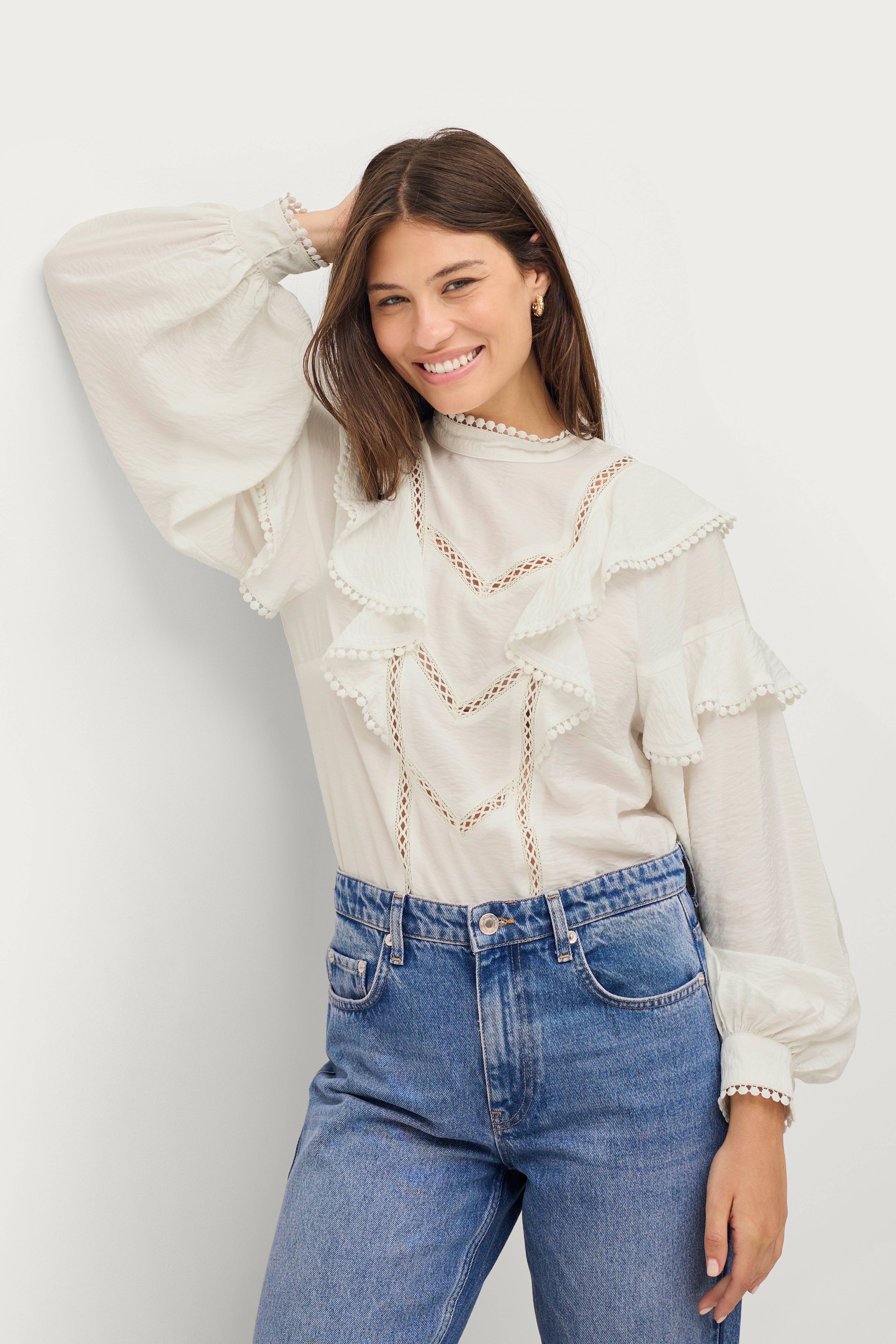 Flot bluse med flæser og blonder.