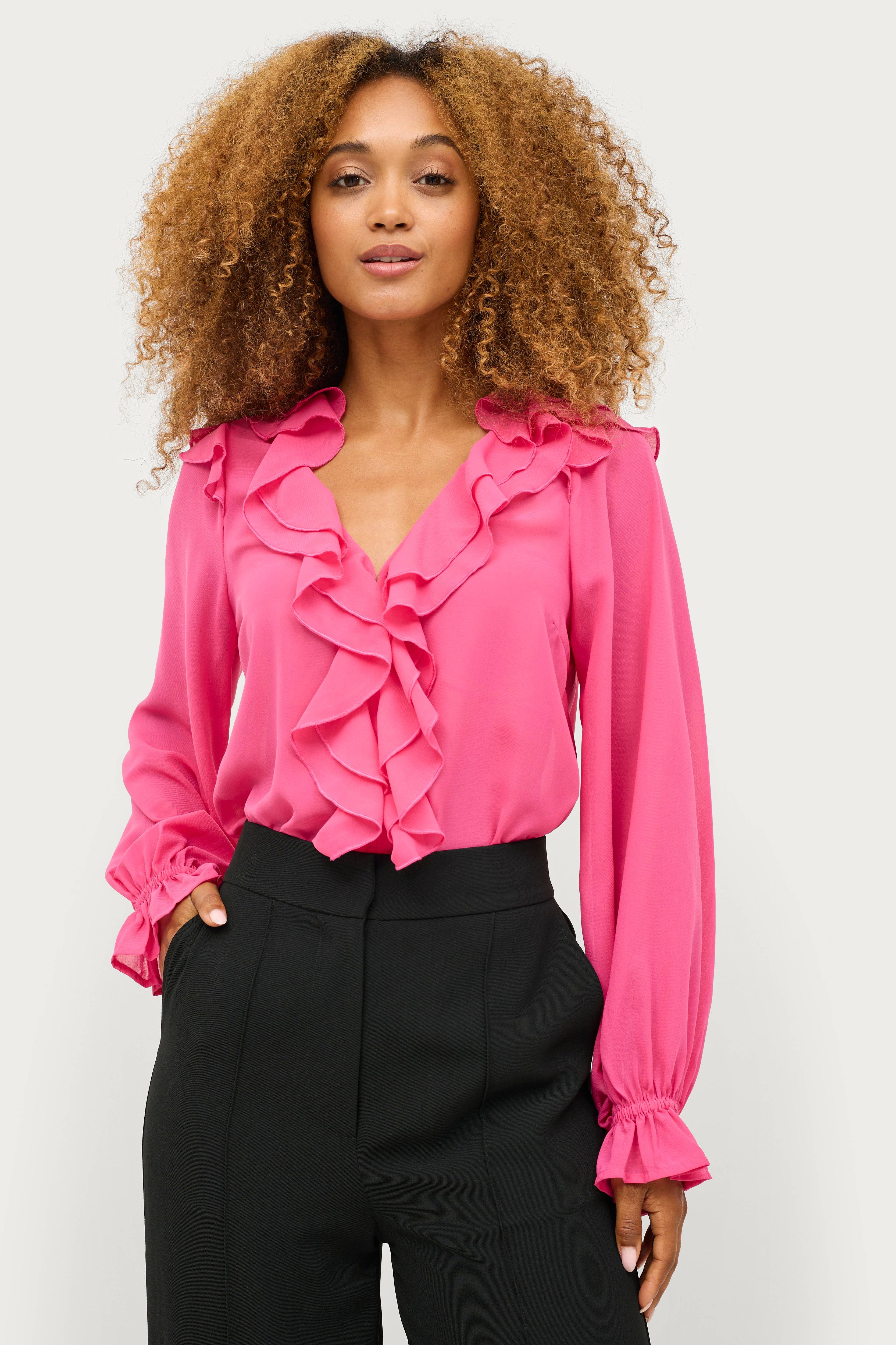 • Tynd, halvgennemsigtig bluse i chiffon• V-udskæring med flæse• Ballonærmer med flæsemanchetter• Flæser på skuldrene• Længde: 60 cm i størrelse 34/36.