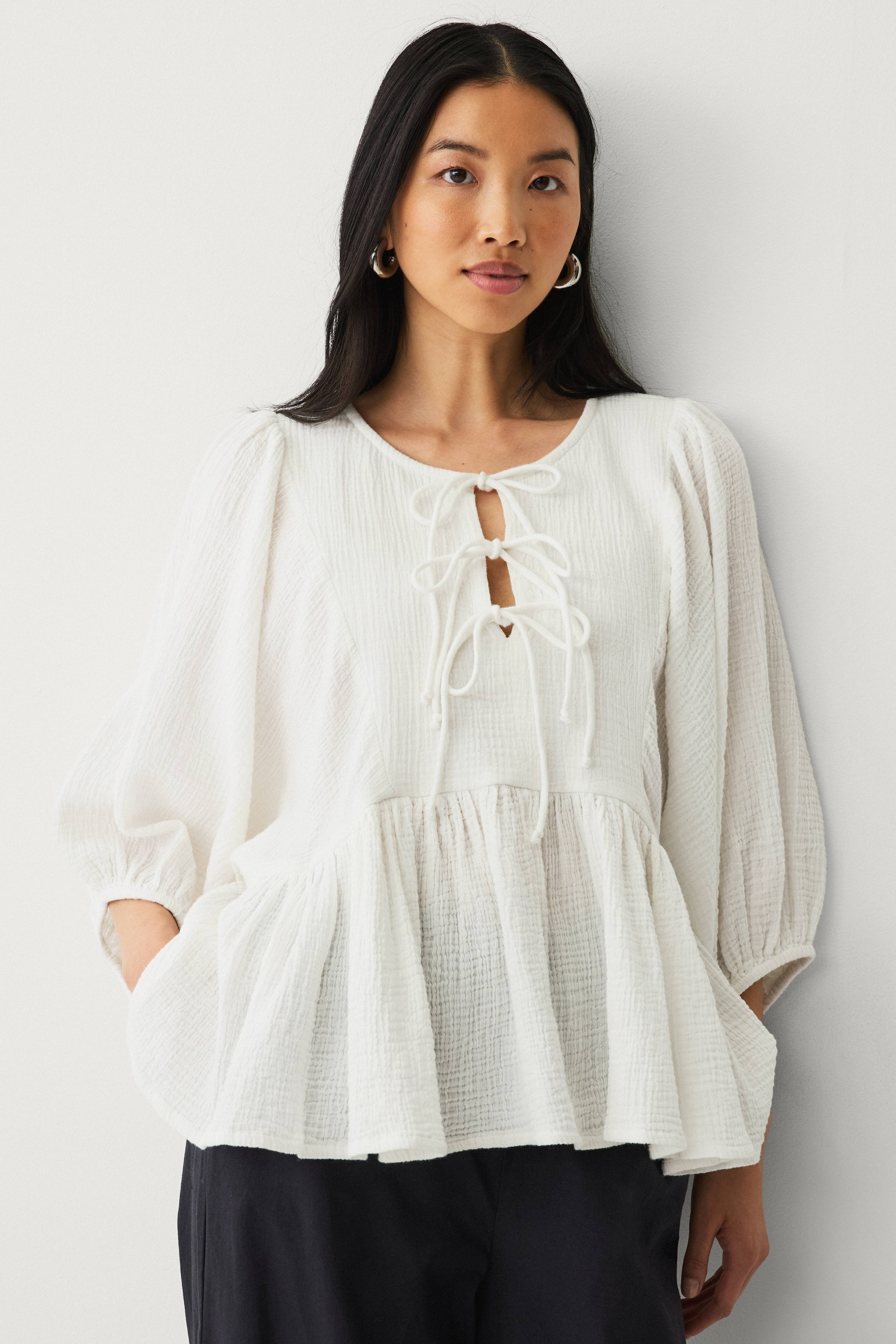 • Bluse i bomuldsmuslin med let struktur• Rund hals• Slids med bindebånd foran• Brede flagermusærmer med elastik ved manchetterne• Volant ved nederste kant med samling• Længde: 62 cm i størrelse S