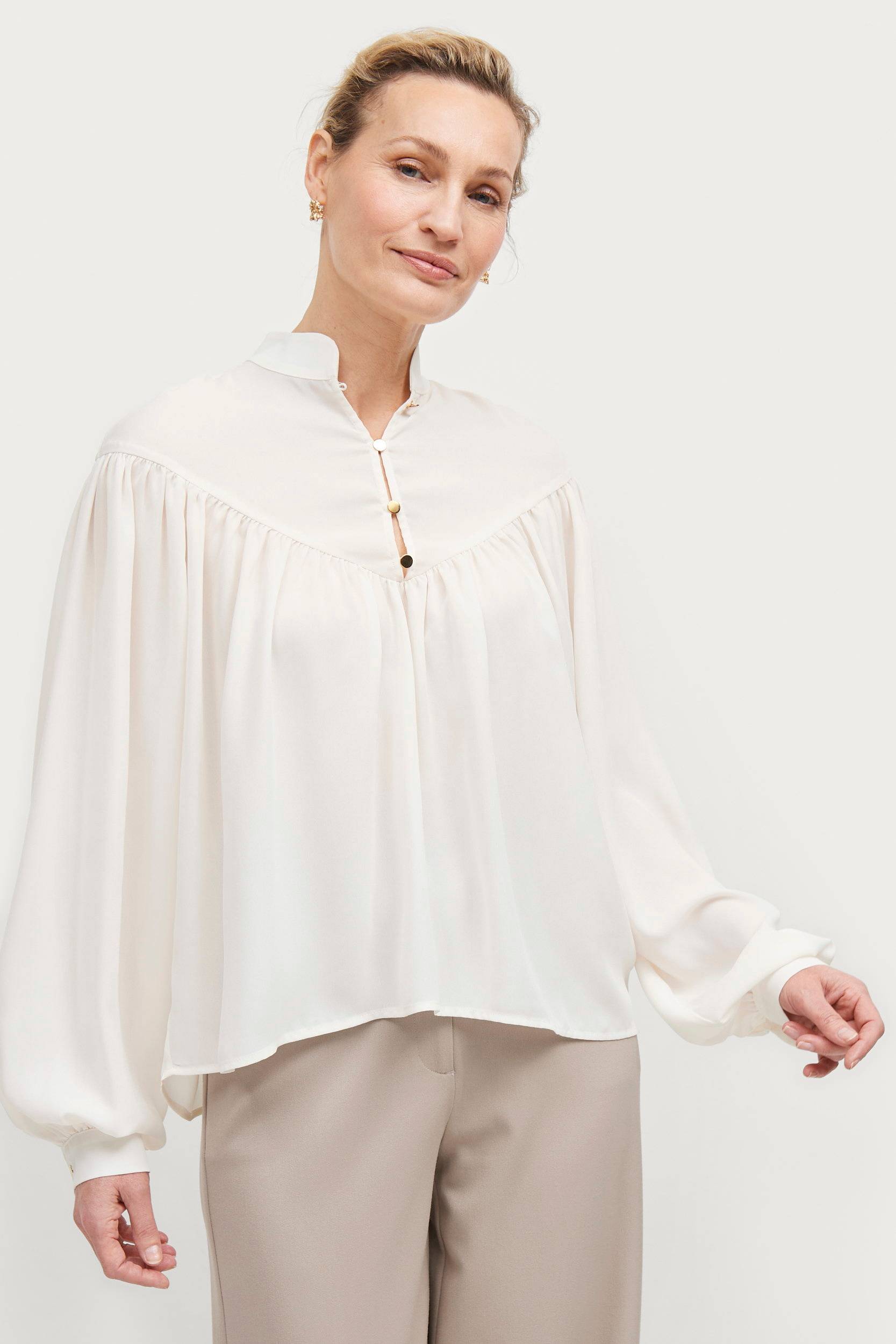• Høj halsudskæring• Rynket søm ved brystet• Bred, løs pasform• Knapper oppe foran• Ballonærmer med manchet• Længde: 64 cm i størrelse 34/36