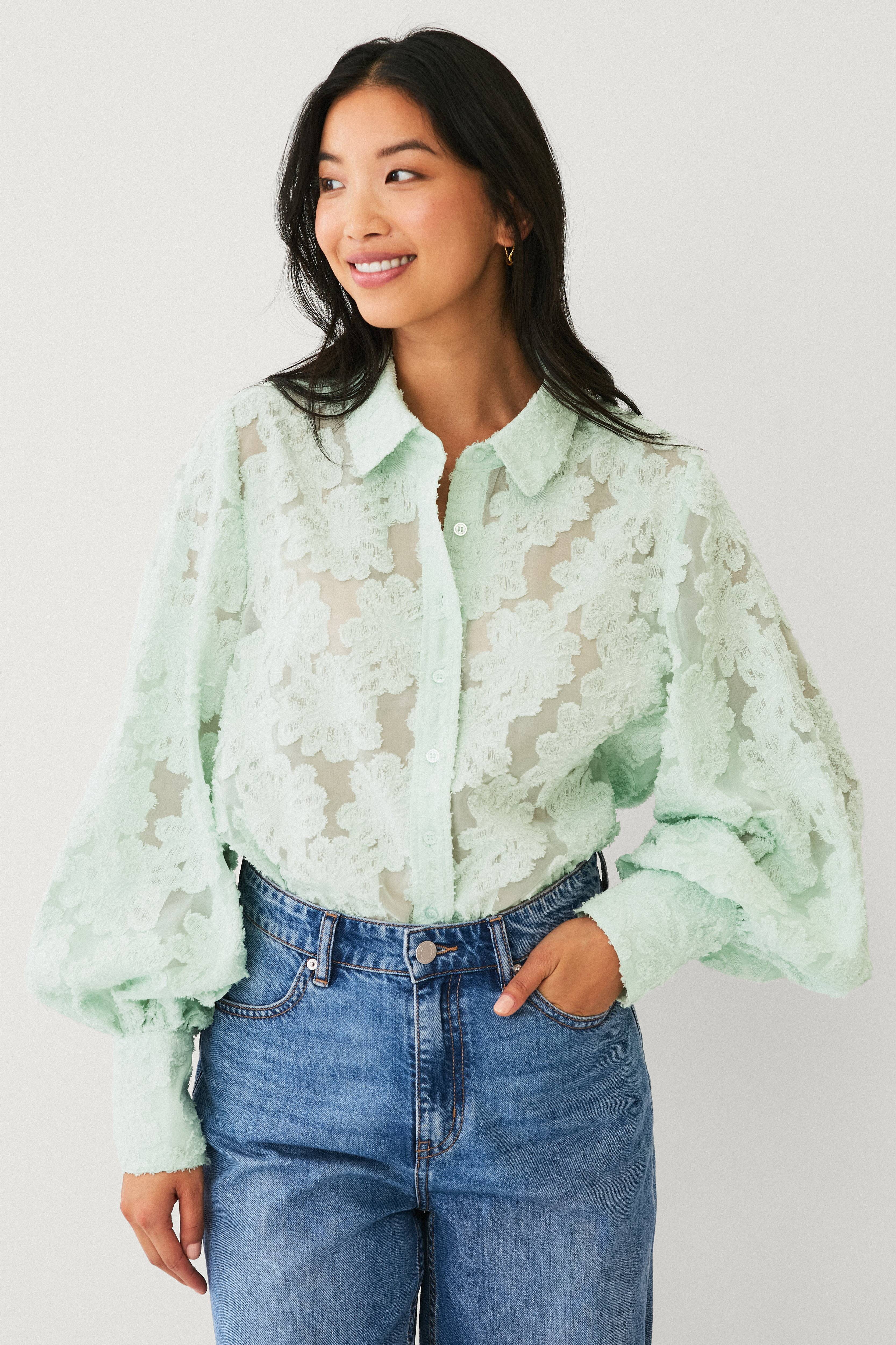 • Transparent stof med broderet mønster• Krave• Knaplukning• Brede ærmer• Manchet med tre knapper• Længde: 56 cm i størrelse S