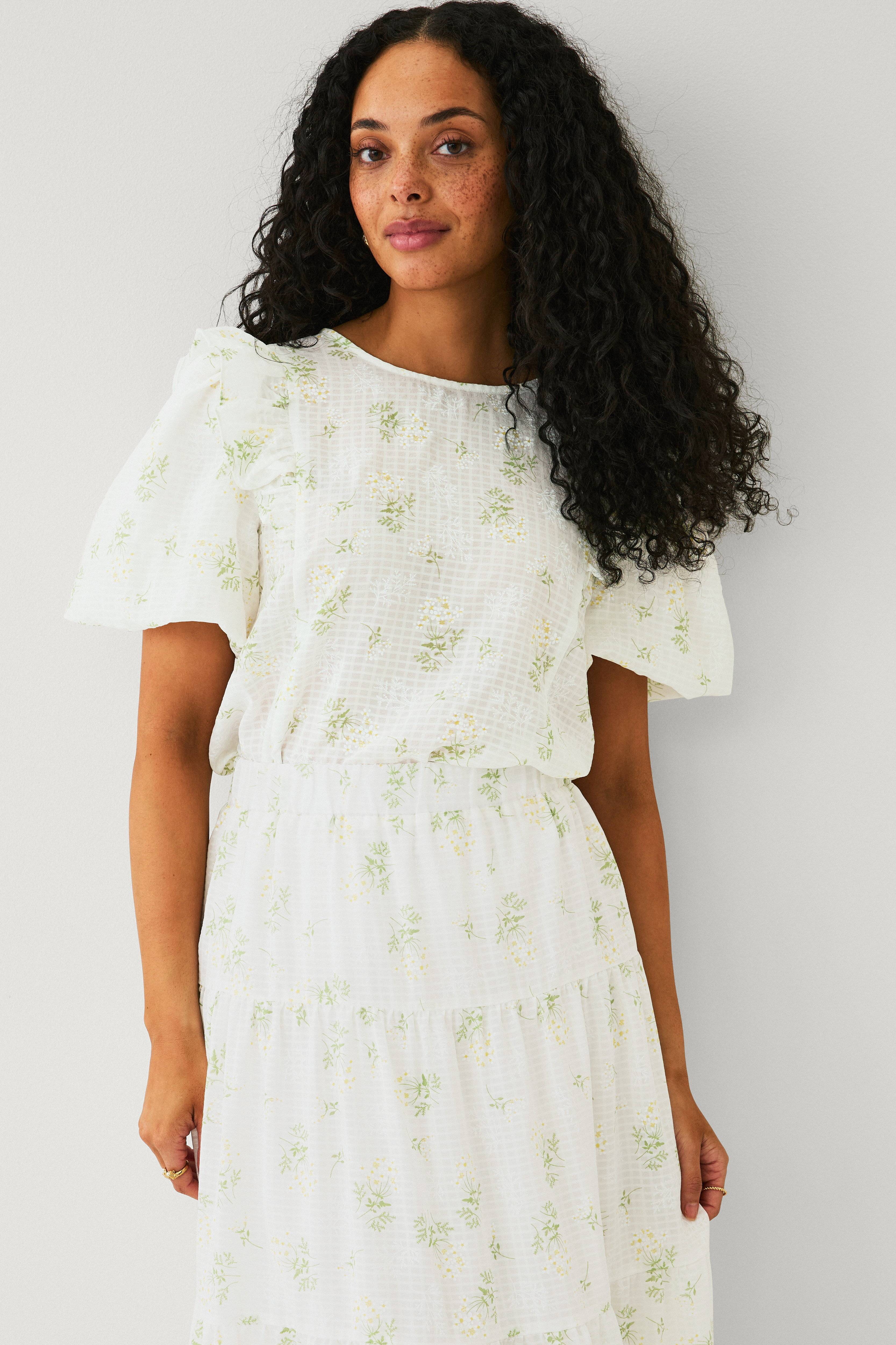 Supersød bluse i cremefarvet stof med struktur. Jeg købte størrelse L, som passede mig, der har størrelse 46.