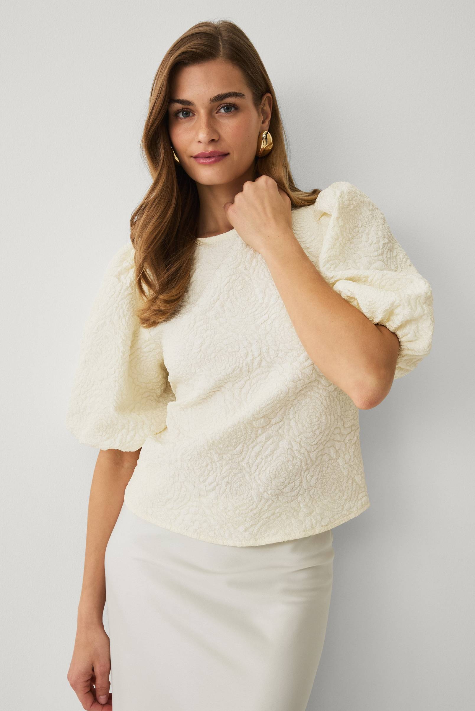 • Jacquardvævet bluse med rund halsudskæring• Nøglehulsåbning med bindebånd i nakken• Halvlange ballonærmer med elastik ved manchetterne• Længde: 57 cm i størrelse S