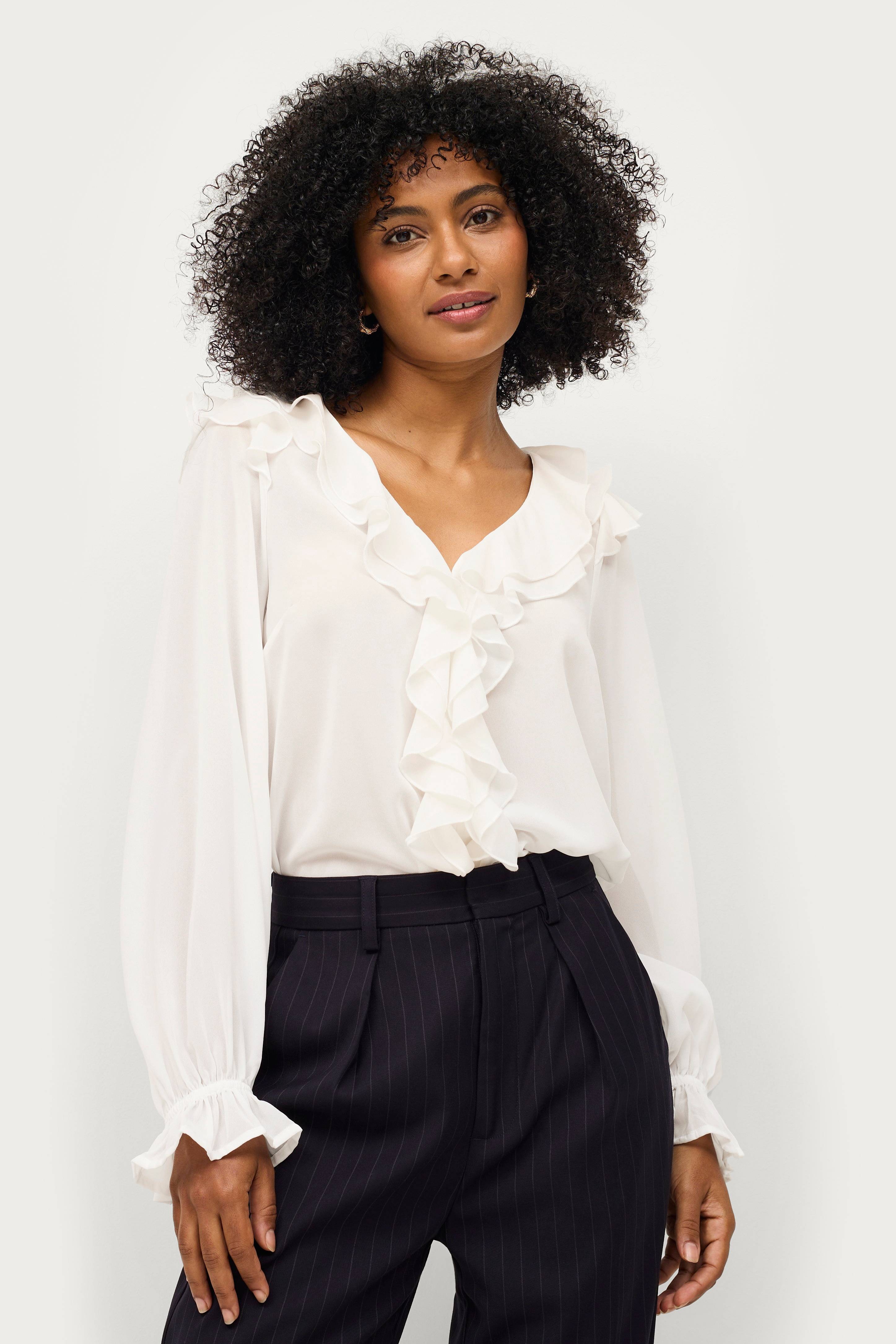 • Tynd, halvgennemsigtig bluse i chiffon• V-udskæring med flæse• Ballonærmer med flæsemanchetter• Flæser på skuldrene• Længde: 60 cm i størrelse 34/36.
