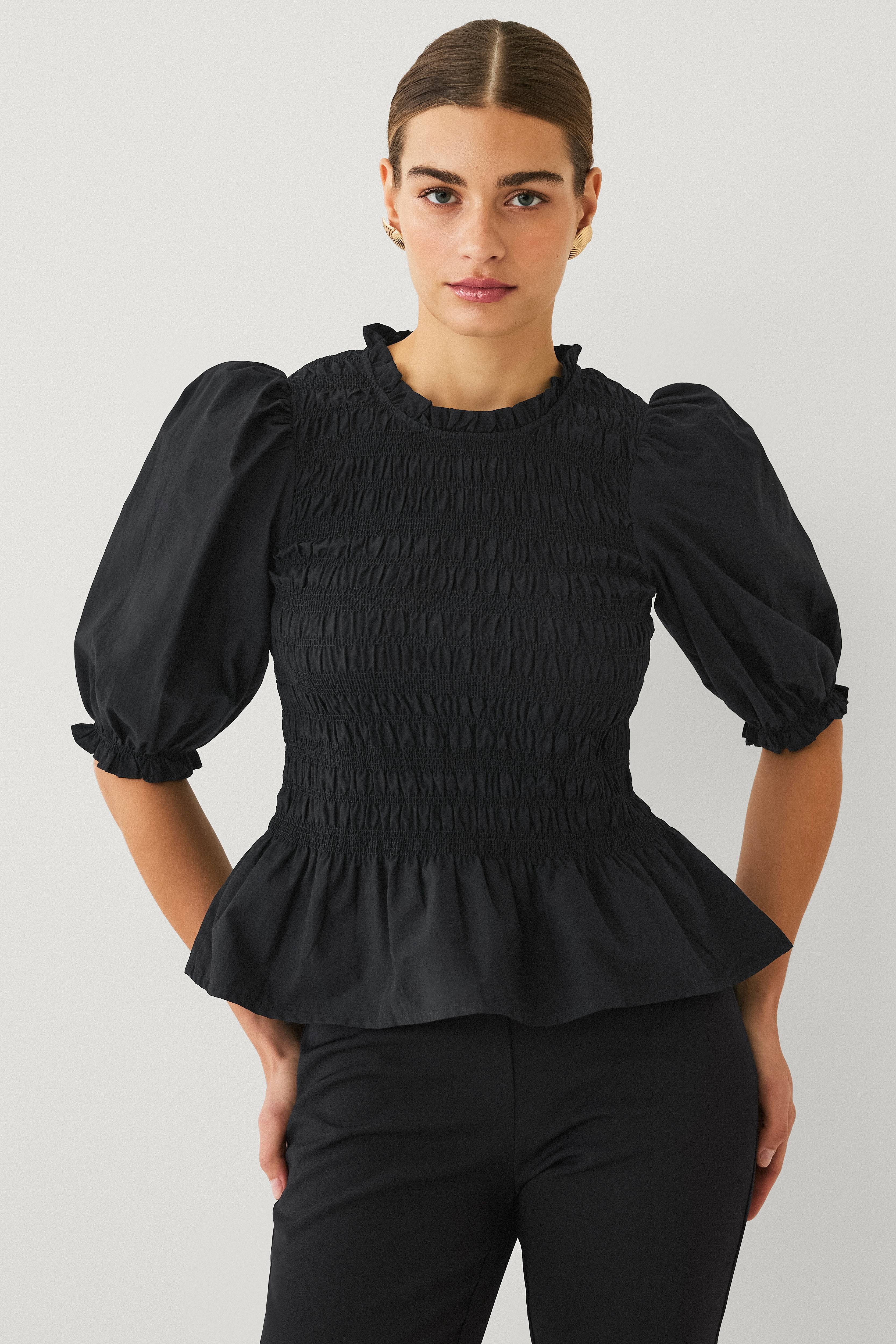 • Figurformede model med elastiksømme hele vejen rundt• Rund hals med lille volant og knap i nakken• Halvlangt ballonærme med elastik nederst• Længde: 58 cm i størrelse S