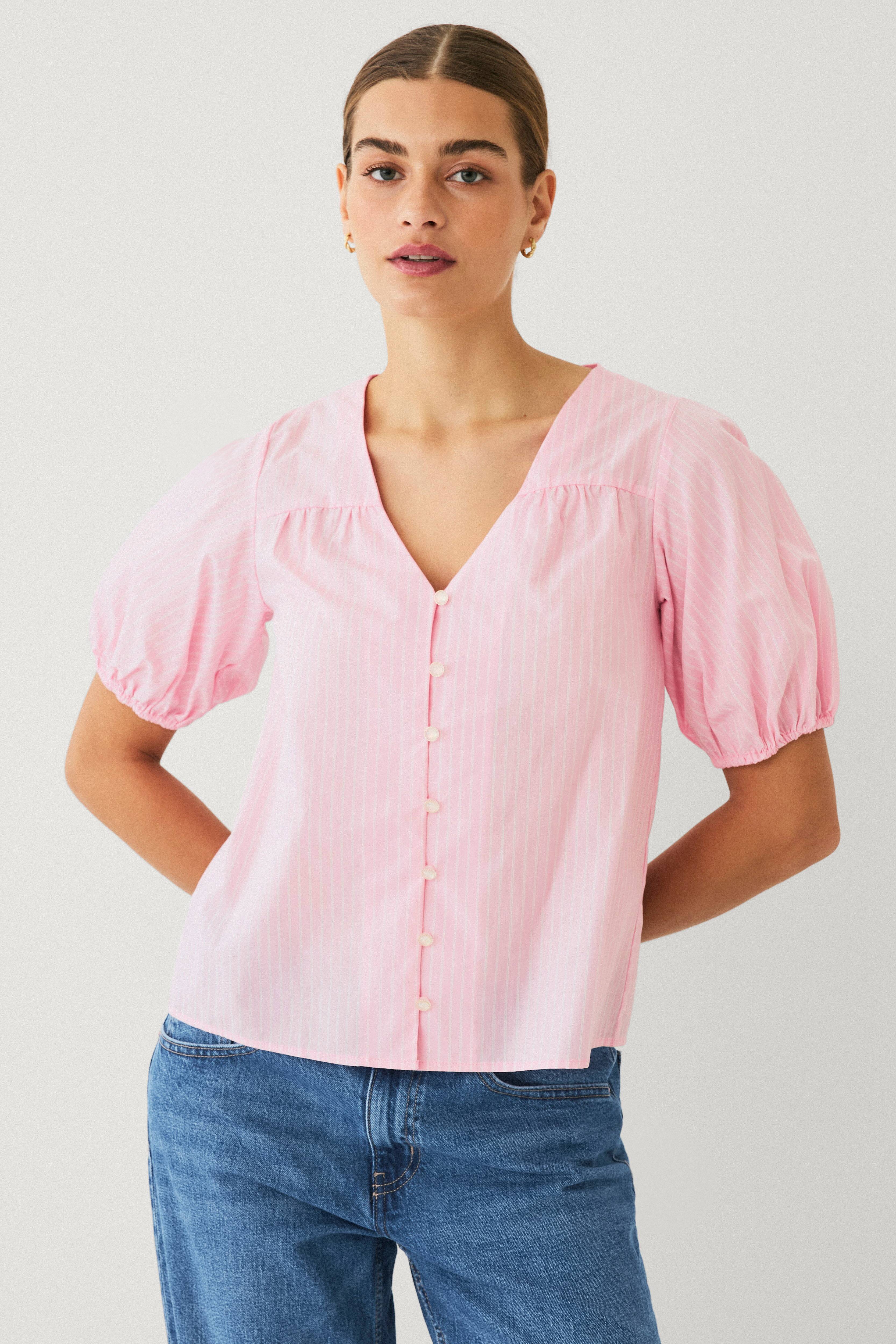 • Smalstribet bluse i bomuldsblanding• Korte ballonærmer med elastik ved manchetterne• V-formet halsudskæring• Perleknaper
