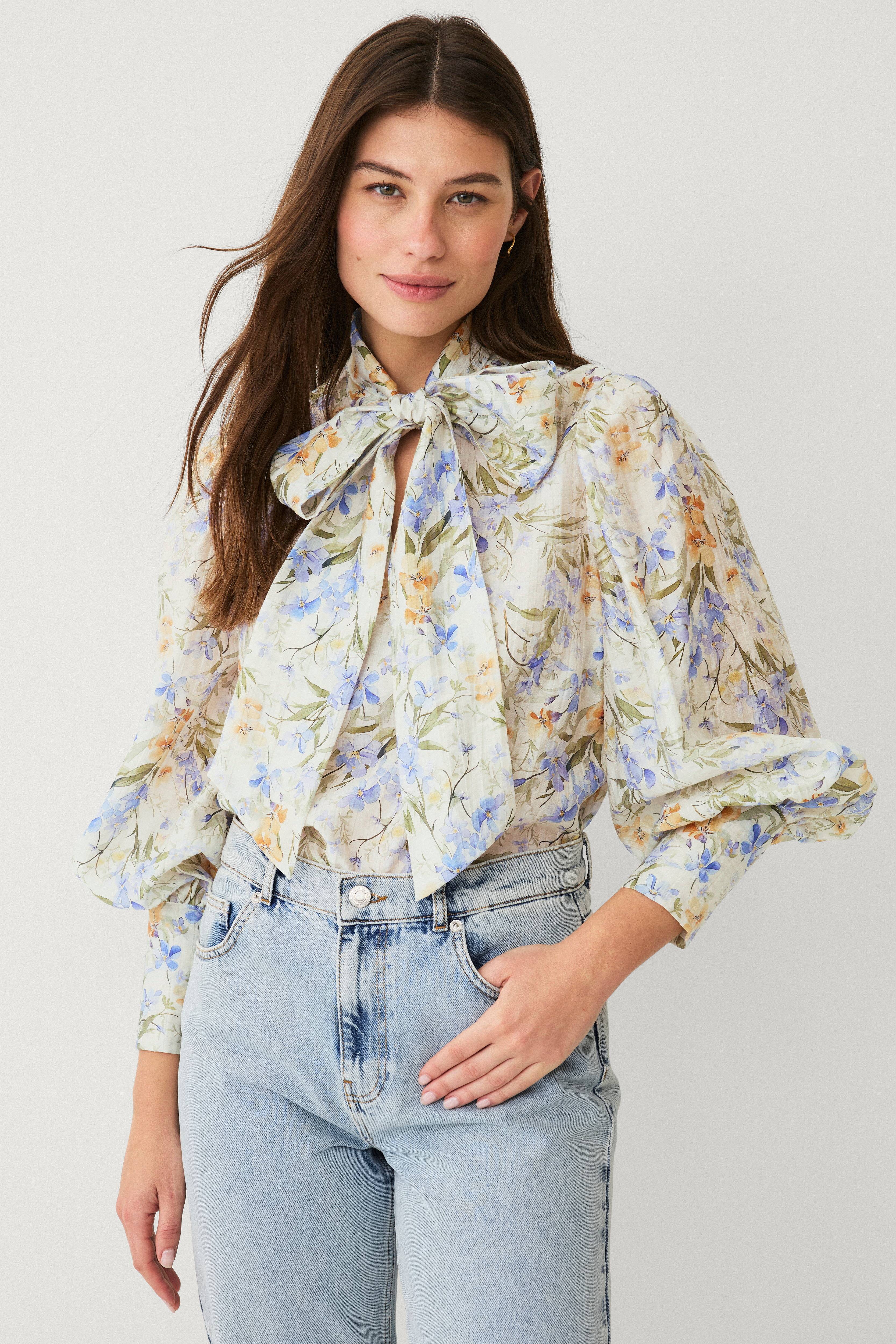 • Tynd bluse i semitransparent materiale med et blomstermønster• Langt ballonærme med manchet og transparente, dekorative Knapperer• V-formet halsudskæring med sløjfe• Længde: 62 cm i størrelse S