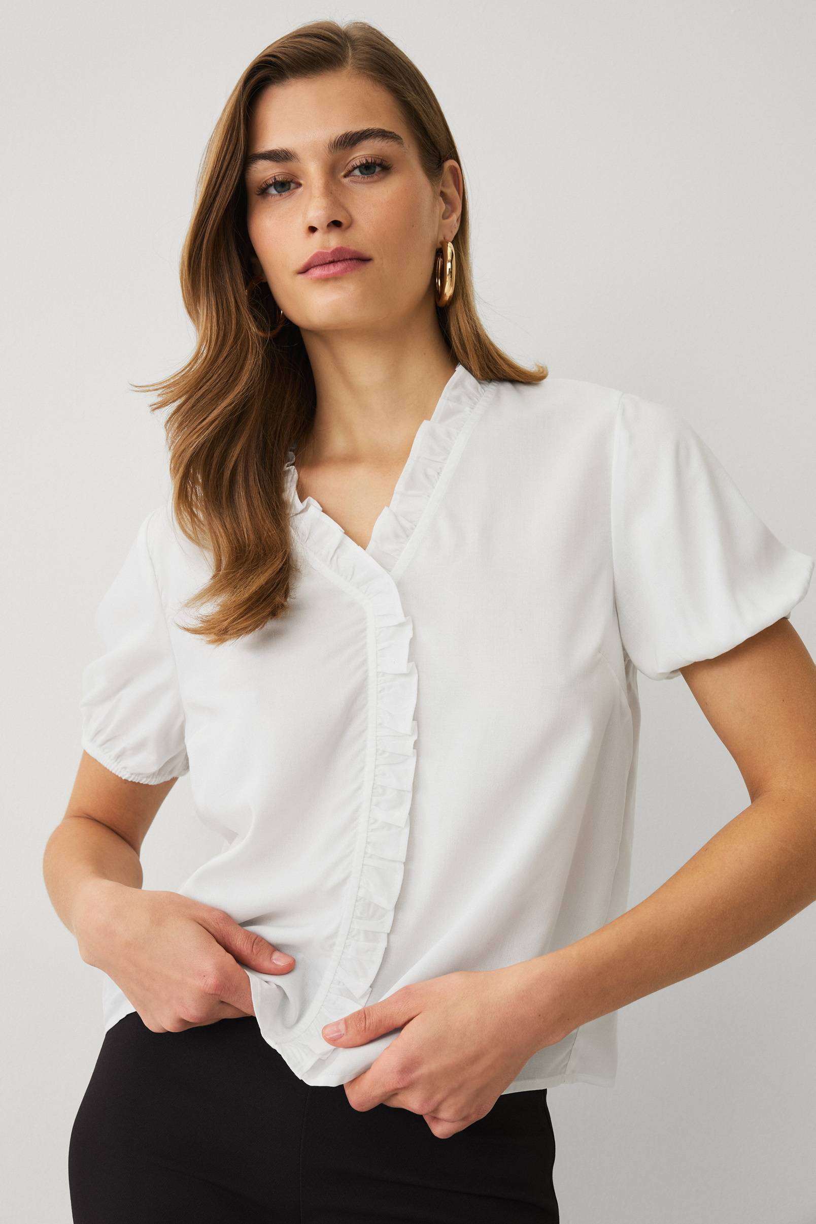 • Bluse i viskose• V-formet halsudskæring• Korte ærmer med elastiske ærmeafslutninger• Volant rundt om halsudskæringen og foran• Længde: 57 cm i størrelse S